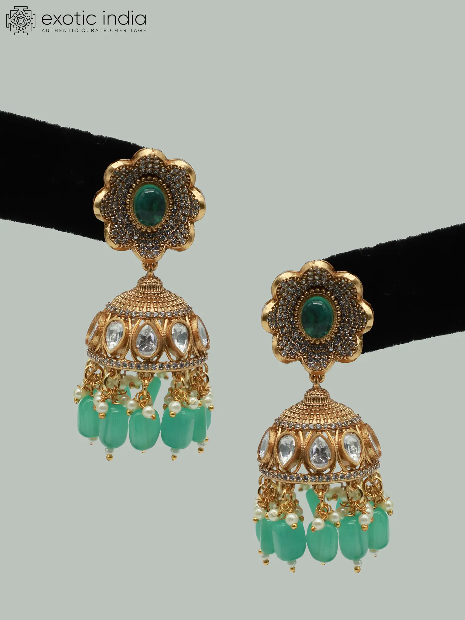 Features a prominent green stone centerpiece surrounded by intricate Kundan work.