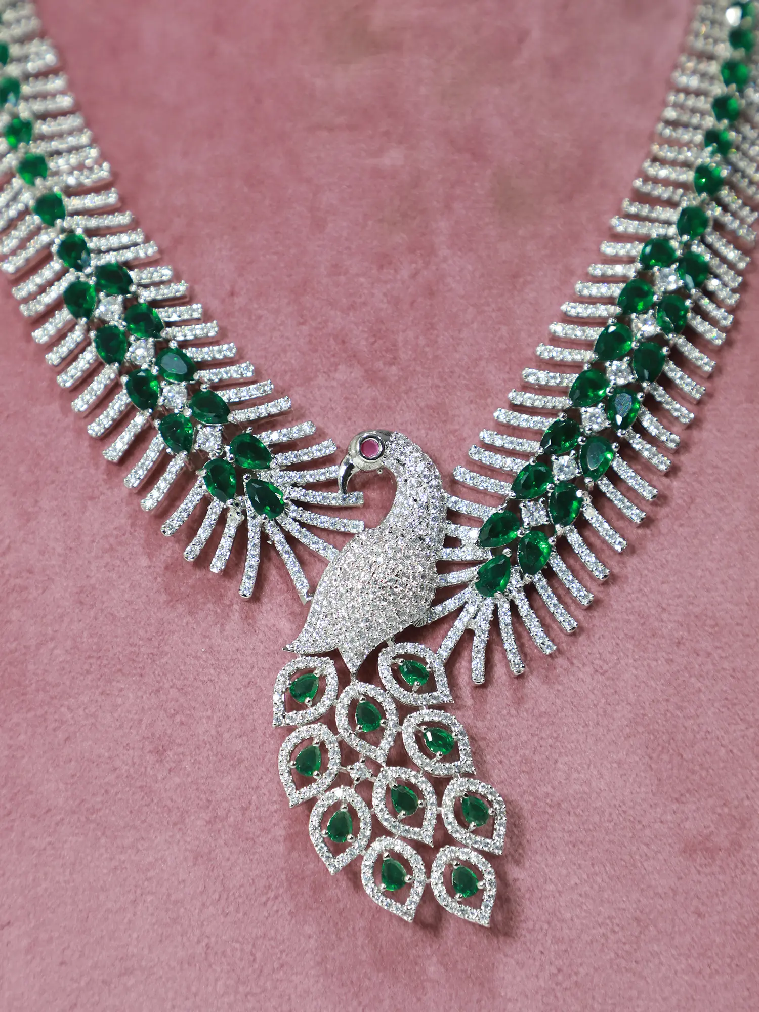Make a statement with this exquisite necklace set, featuring a captivating peacock design meticulously crafted with shimmering American diamonds. The intricate detailing and radiant stones create a piece that effortlessly blends modern style with timeless elegance. Perfect for weddings, galas, or any special occasion where you want to radiate sophistication and charm. This set is more than just jewelry; it's a reflection of your refined taste and impeccable style. The light catches the stones beautifully, creating a mesmerizing sparkle that will turn heads wherever you go.