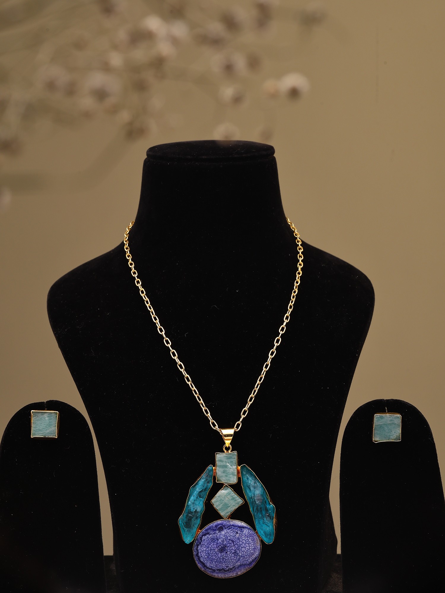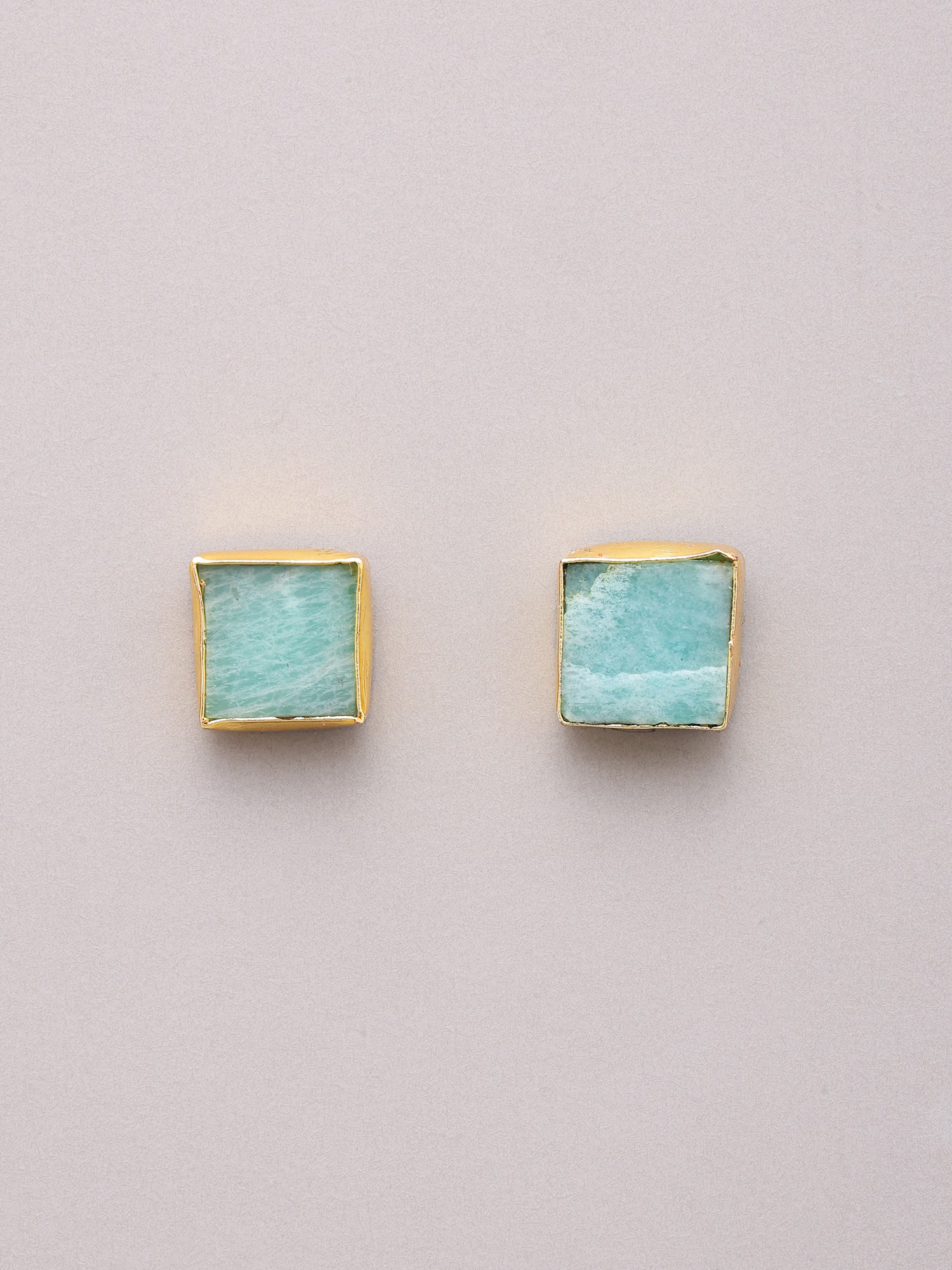 Completing this harmonious set are a pair of matching stud earrings. Each earring mirrors the aesthetic of the pendant, featuring a smaller, precisely cut square stone in a soothing aquamarine hue. These earrings offer a subtle yet sophisticated accent, ensuring a cohesive and polished look. Their compact size makes them perfect for everyday wear, while their unique design adds a distinctive flair. This set is an ideal choice for those who appreciate the artistry of natural gemstones and seek jewelry that is both distinctive and elegantly understated. Whether you're dressing up for a special occasion or adding a touch of refined beauty to your daily ensemble, this brass necklace and earring set promises to be a treasured addition to your collection. It’s a perfect gift for someone special or a well-deserved indulgence for yourself, offering enduring style and a connection to the natural world.