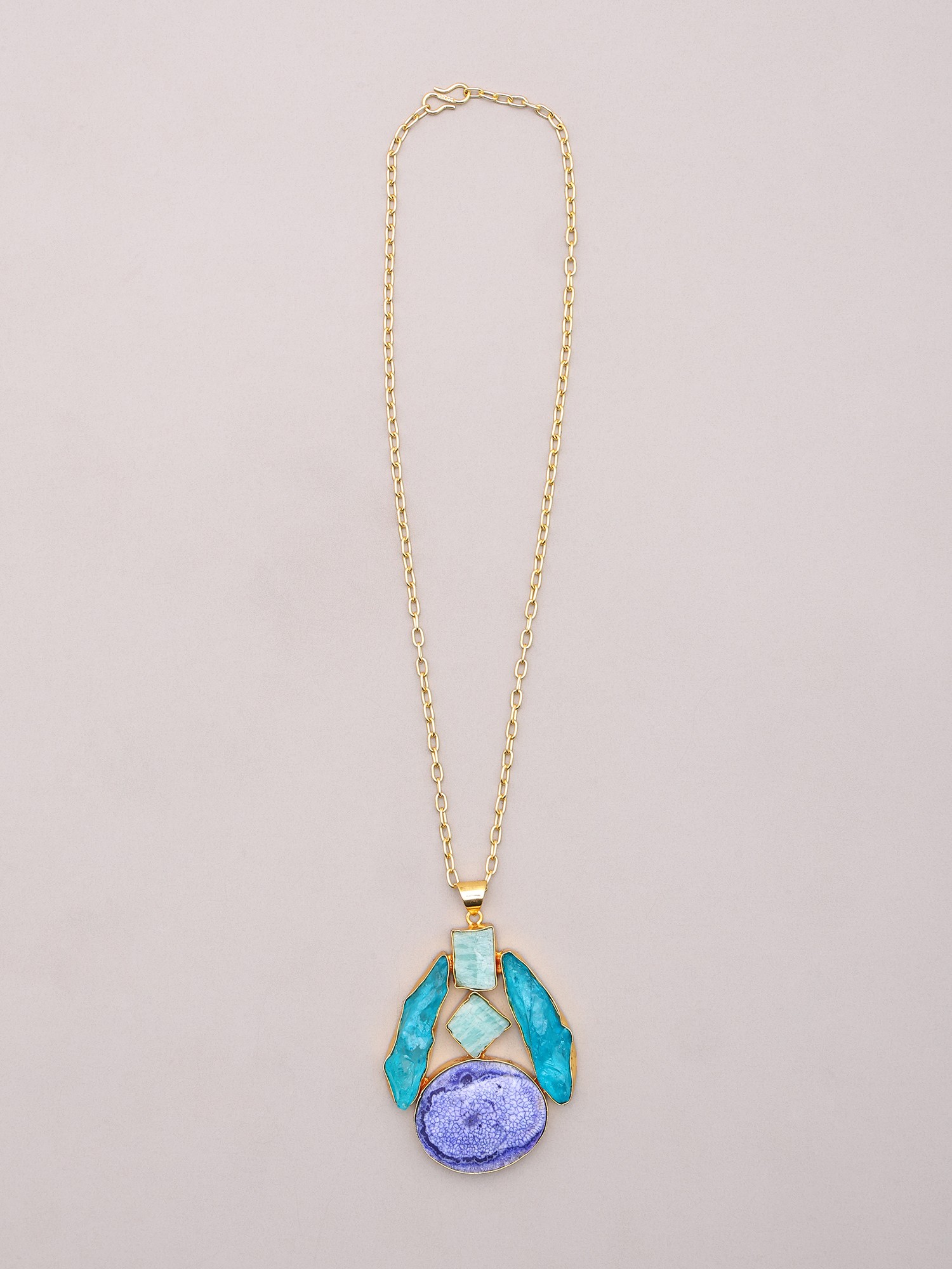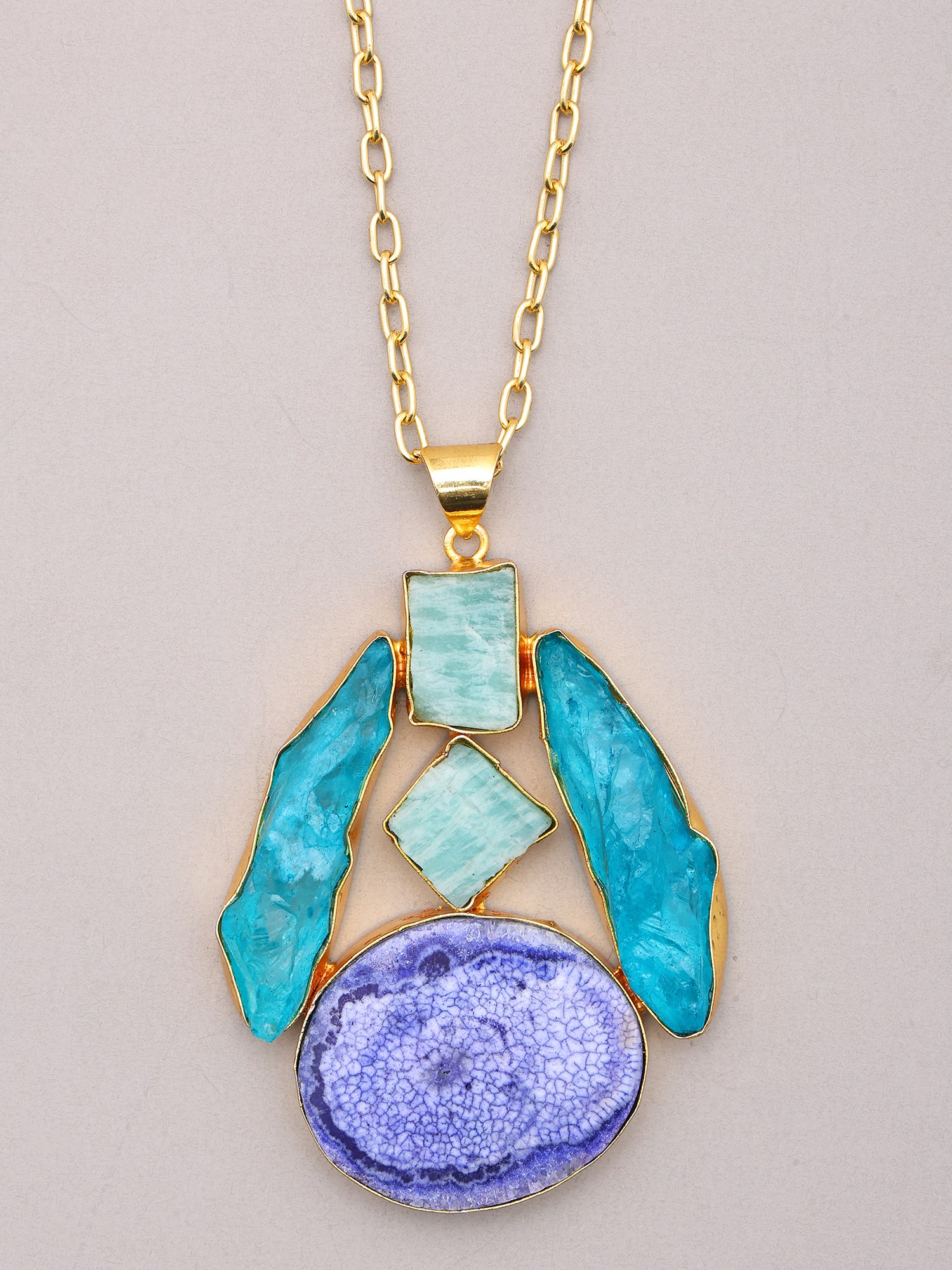 Discover a captivating fusion of natural beauty and artisanal craftsmanship with this exquisite brass necklace and earring set. Inspired by the tranquil depths of the ocean, this ensemble features a symphony of blues and greens, designed to add a touch of serene elegance to any attire. The pendant, a true statement piece, is adorned with a striking arrangement of carefully selected stones. Each stone showcases unique organic forms and mesmerizing color variations, from pale aquamarine to deep, rich teal, evoking the subtle yet powerful allure of the sea. The centerpiece of the pendant is a vibrant, circular stone with a unique crackled texture, reminiscent of a tide pool’s intricate patterns. This is complemented by angular, faceted stones that catch the light, creating a dynamic interplay of color and sparkle. The raw, untamed beauty of these stones is masterfully set within a lustrous brass frame, highlighting their natural charm and ensuring durability. The delicate yet sturdy brass chain drapes gracefully, allowing the pendant to rest beautifully, drawing the eye with its intricate design.