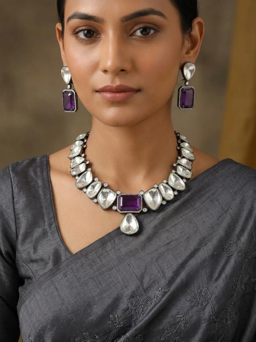Designer Stone Studded Copper And Kundan Necklace Set With Earrings
