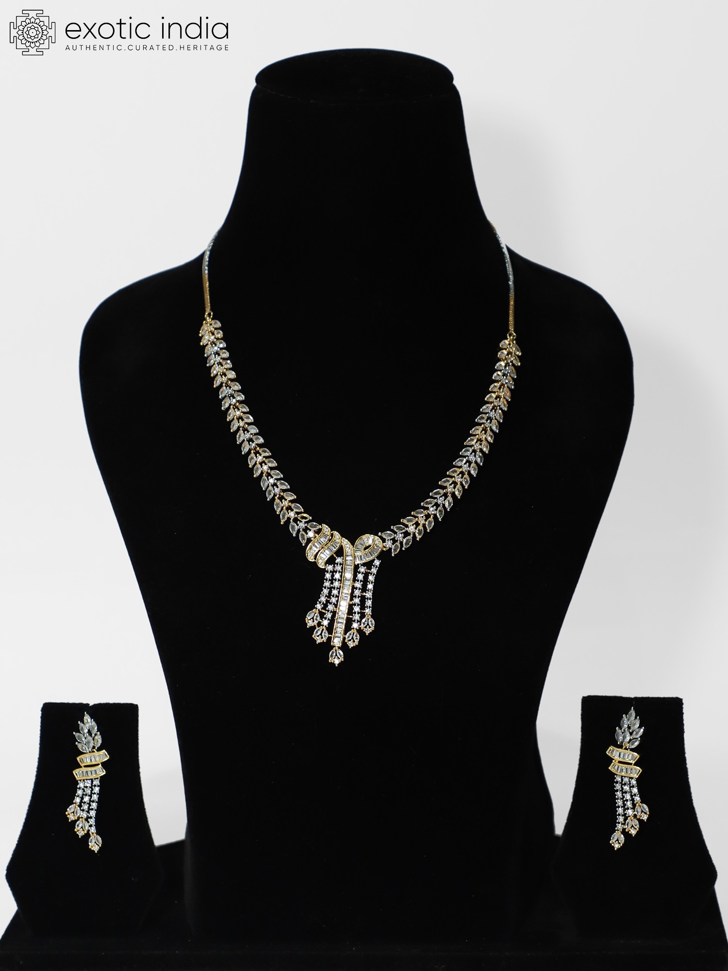 Stone Studded Unique Design Gold Polish Base American Diamond Necklace Set With Earrings