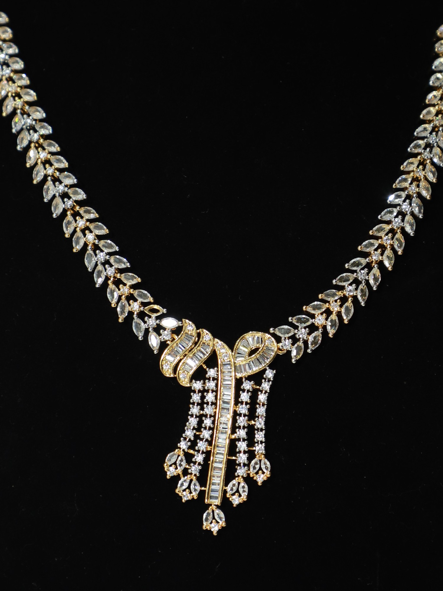 Adorn yourself with a touch of sophisticated sparkle with this captivating necklace and earrings set. Meticulously crafted, this set showcases a blend of classic elegance and contemporary flair, making it a versatile addition to any jewelry collection. The shimmering American Diamonds are carefully set within a lustrous gold polish base, creating a radiant and eye-catching effect. This set is designed to elevate your style, whether you're dressing up for a special occasion or adding a touch of glamour to your everyday look. The necklace features a graceful design that sits beautifully around the neckline. A delicate chain, embellished with meticulously placed stones, gently leads to a stunning central pendant. The pendant showcases an intricate arrangement of American Diamonds that mimics the elegant flow of a tied ribbon, complete with delicate, dangling adornments. The gold polish base adds a touch of warmth and richness, enhancing the brilliance of the stones.