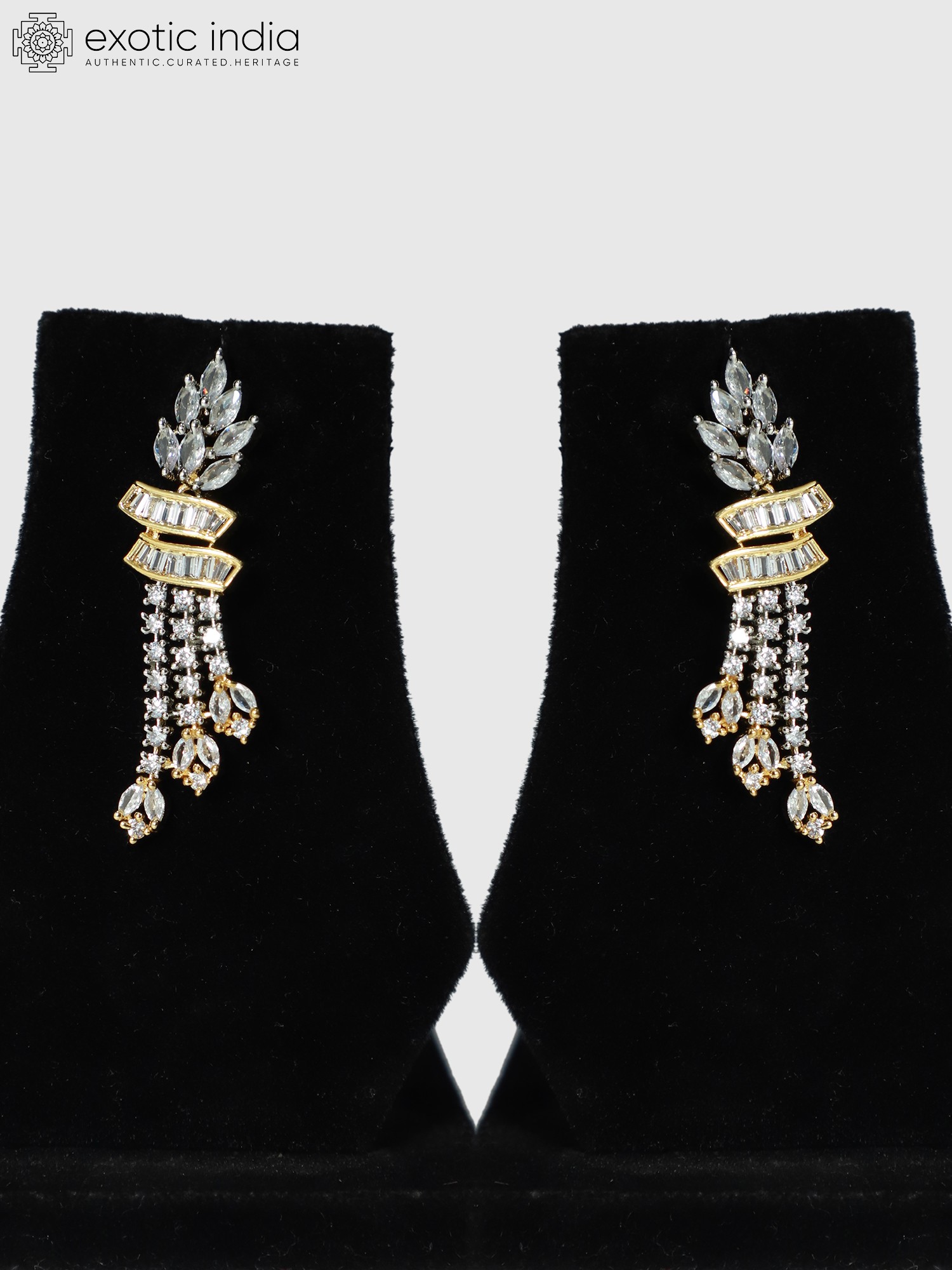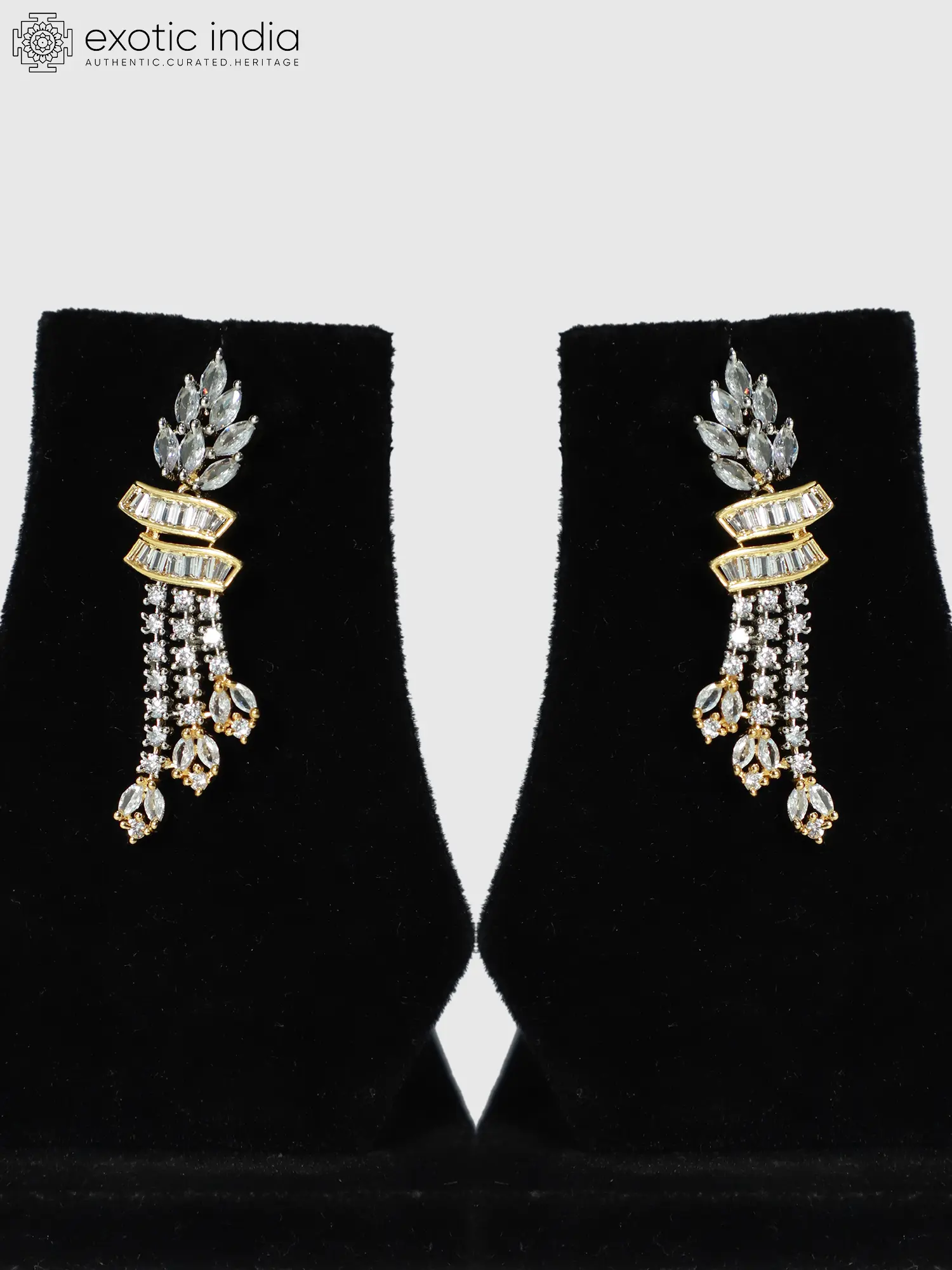 Complementing the necklace perfectly are the matching earrings, which echo the design elements of the pendant. Each earring features a similar cascading arrangement of American Diamonds and gold polish, creating a cohesive and harmonious look. The earrings are designed to be comfortable to wear while making a striking statement. The delicate dangling design ensures they catch the light with every movement, adding to the overall allure of the set.