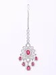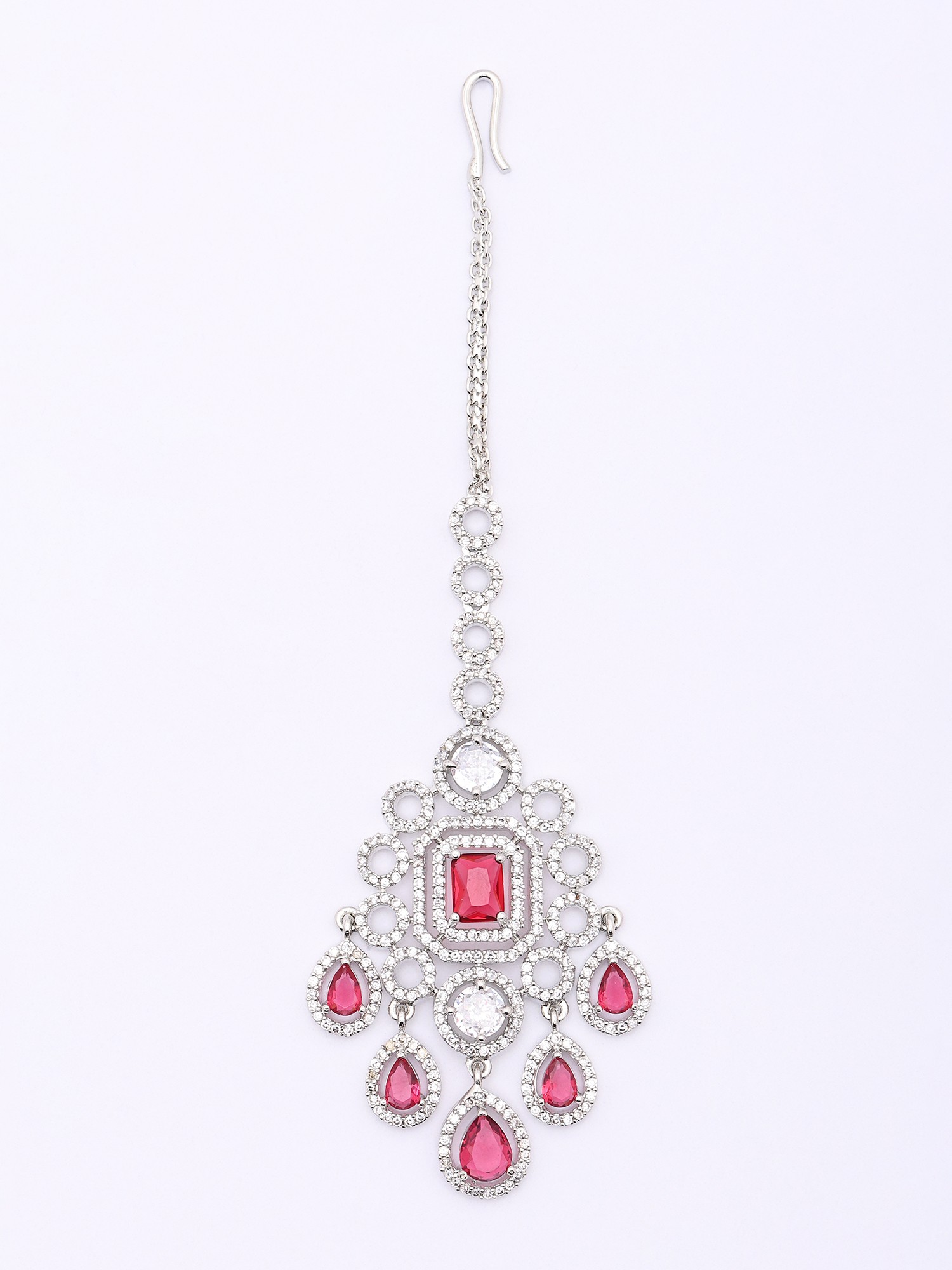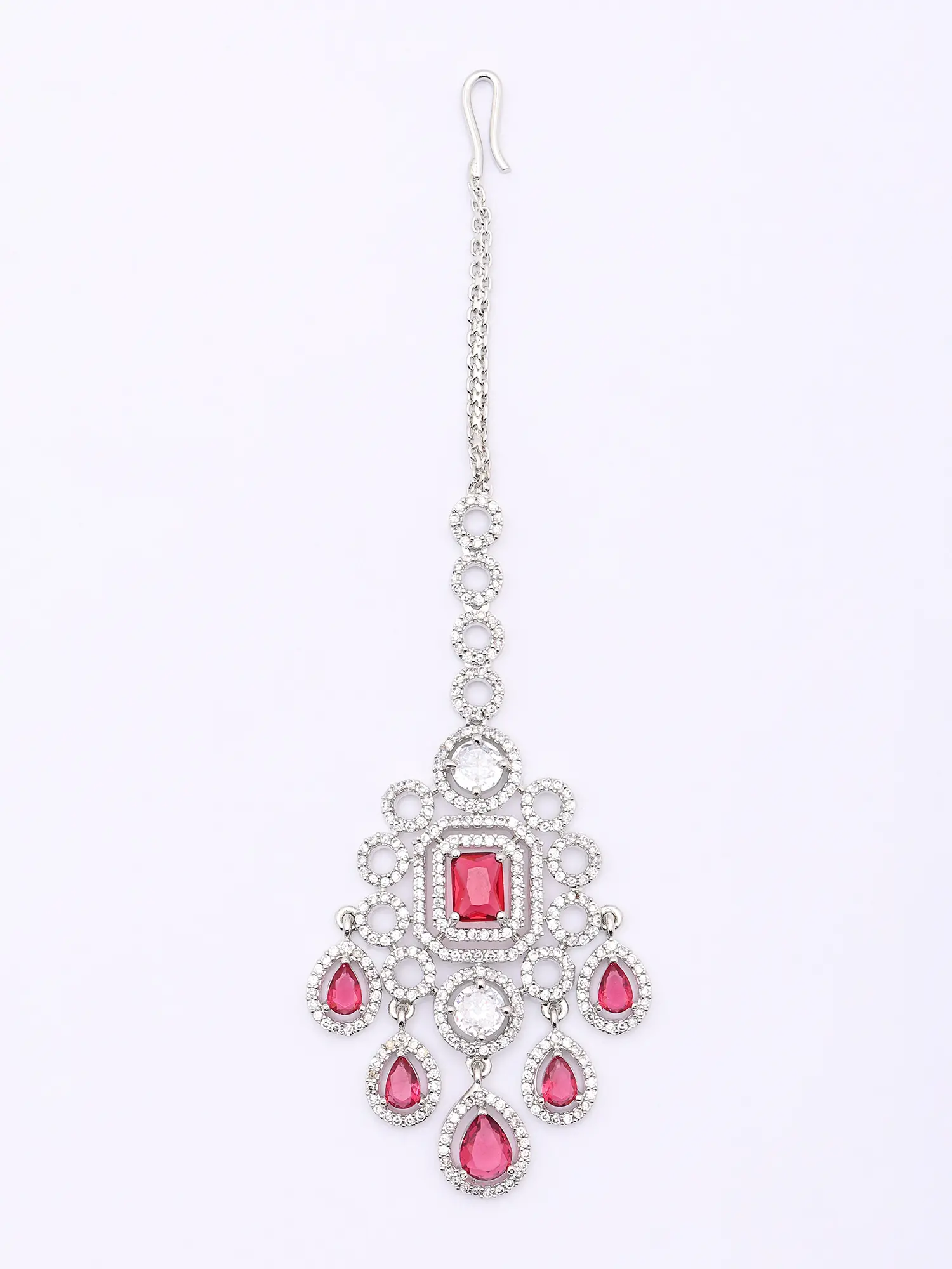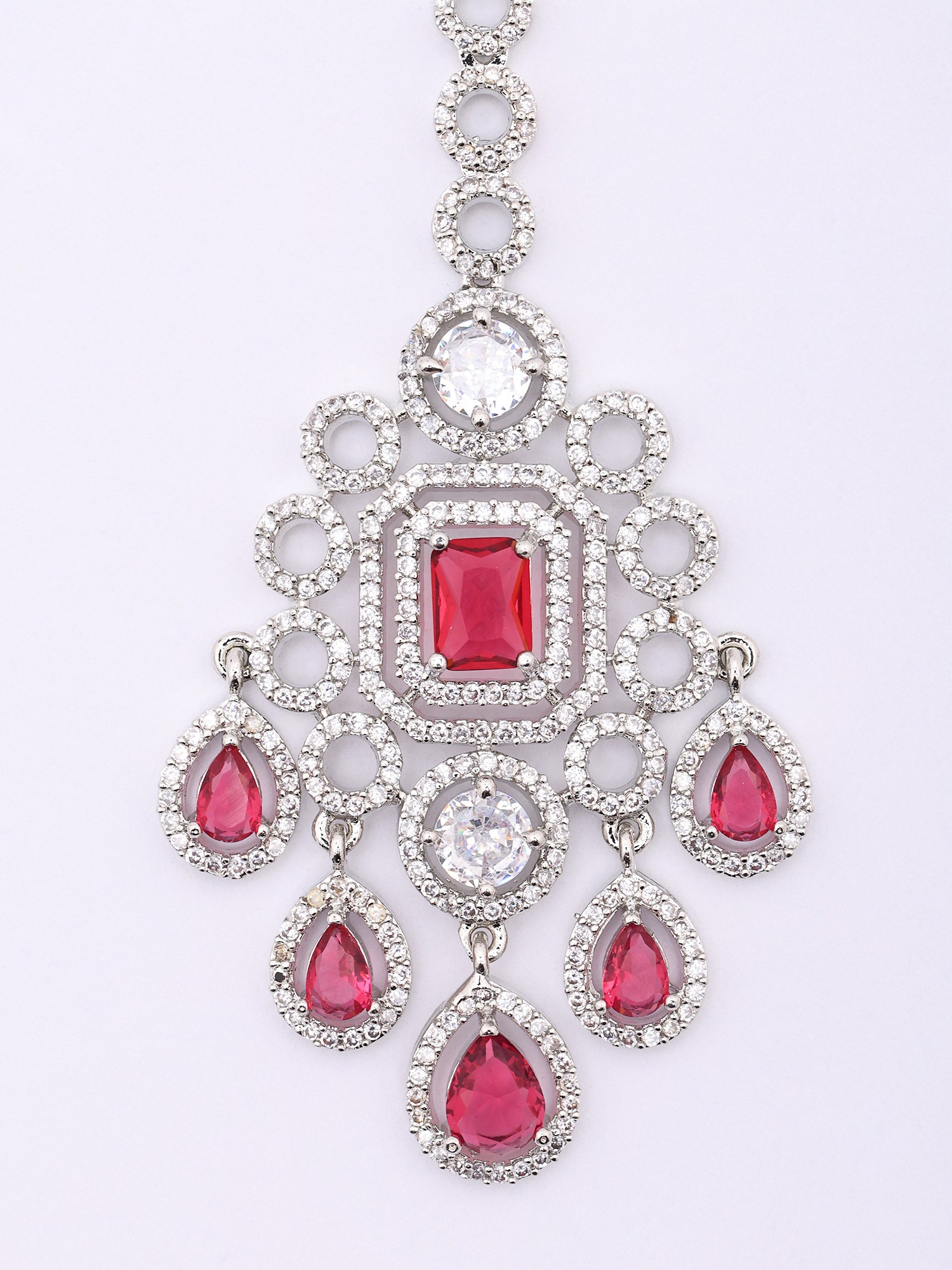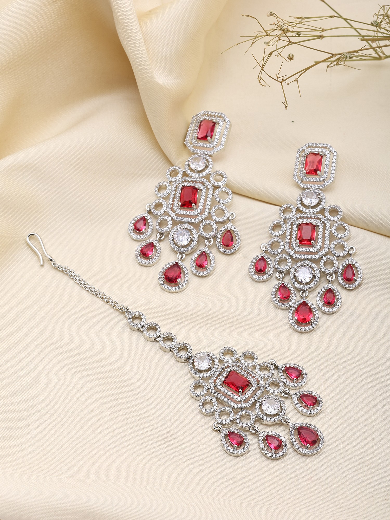 The earrings, measuring a graceful 2.75 inches in height and 1.25 inches in width, feature a stunning cascade of sparkling American diamonds surrounding captivating red stones. Complementing this, the matching maang tikka extends an impressive 5.15 inches in length with a 1.25-inch width, designed to beautifully frame your face. The intricate detailing of the settings and the fluidity of the design create a breathtaking visual harmony, ensuring you command attention.