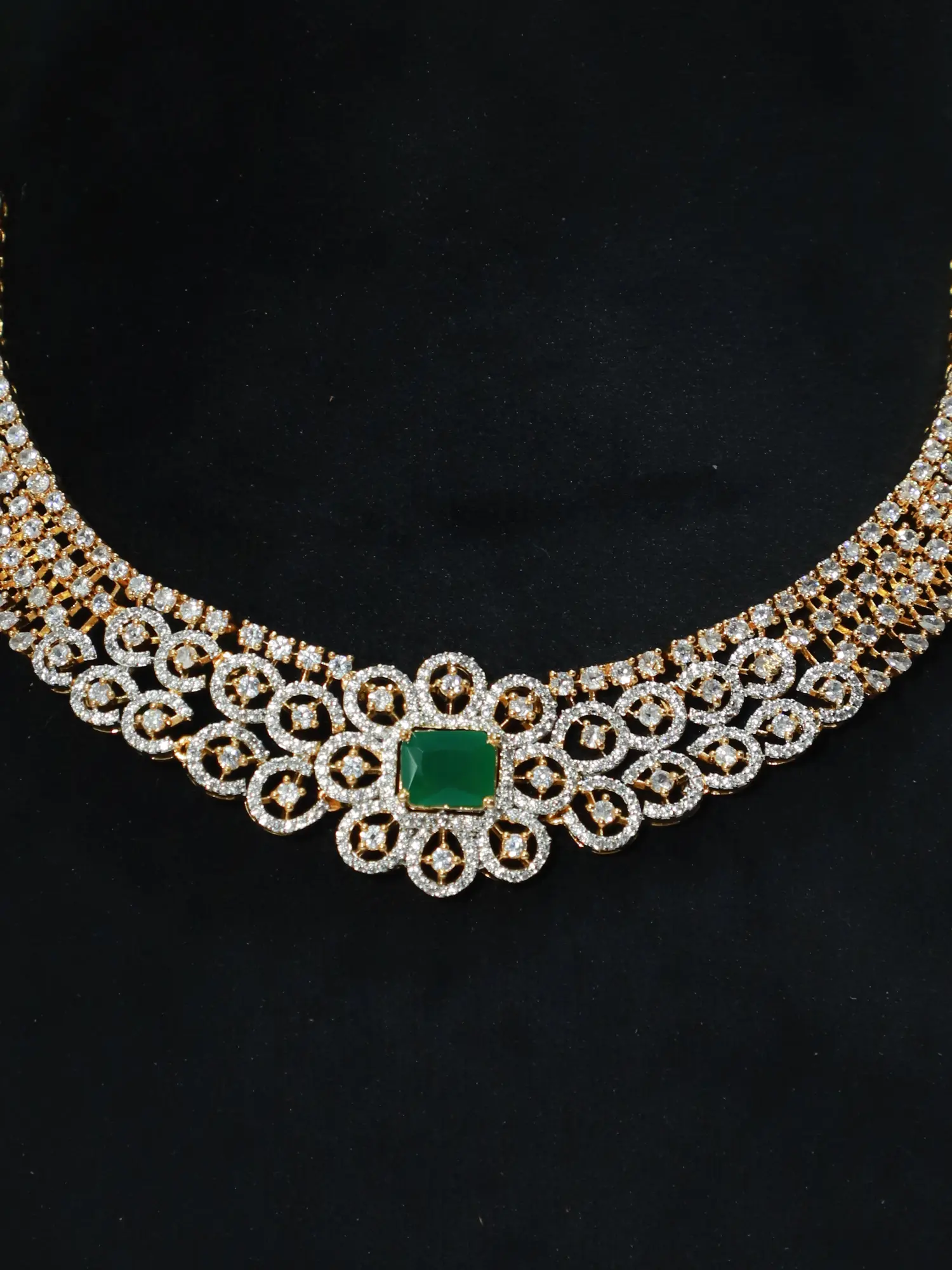 Indulge in the allure of refined elegance with this stunning necklace and earring set. Meticulously crafted, this ensemble is designed to capture the light and turn heads. Perfect for special occasions or adding a touch of glamour to your everyday look, this set is a testament to timeless style and sophisticated design. The brilliant sparkle of the American Diamonds offers a captivating shimmer that rivals the brilliance of genuine diamonds. The necklace features a graceful design that sits perfectly around the neck. The intricate pattern showcases a dazzling array of American Diamonds, each carefully set to maximize their sparkle. The focal point of the necklace is a striking, emerald-toned center stone, adding a pop of color and captivating depth to the overall design. The gold-tone finish enhances the luxurious appeal, making it a versatile piece that complements a variety of outfits and skin tones.