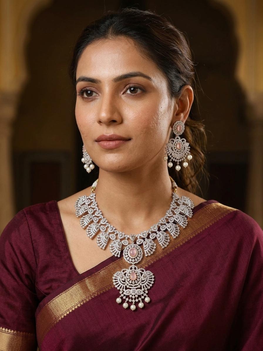 Stunning Stone Studded Embellished American Diamond Necklace Set With Earrings