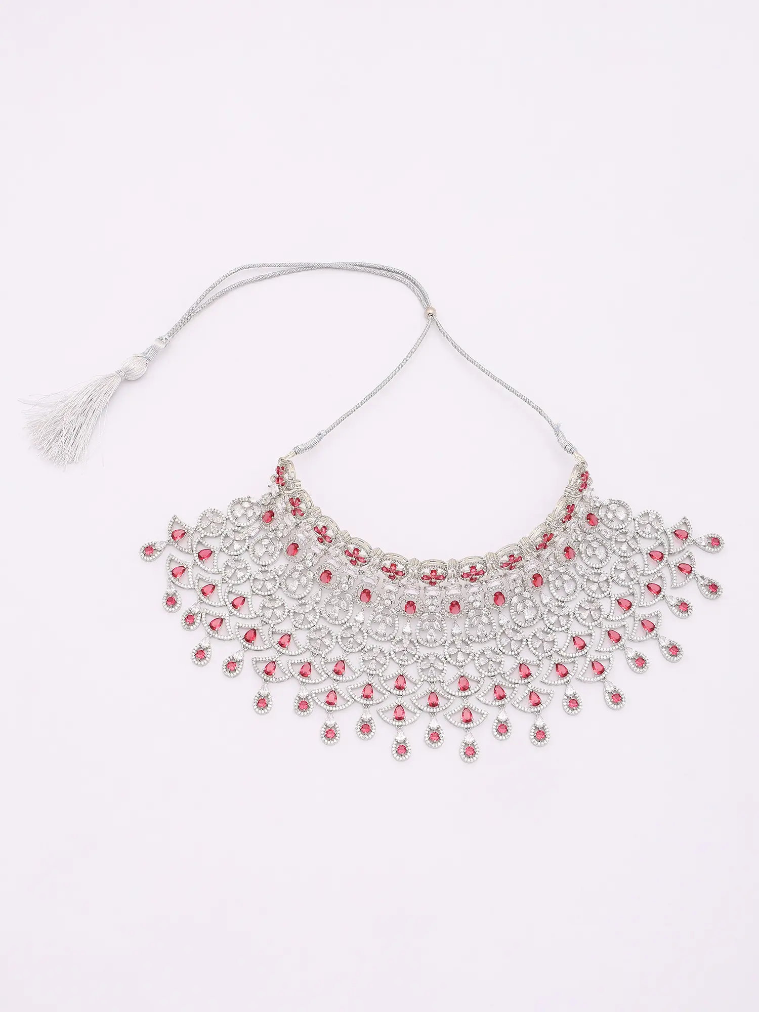 Features a dazzling necklace set adorned with sparkling American diamonds and vibrant ruby-colored stones.