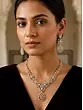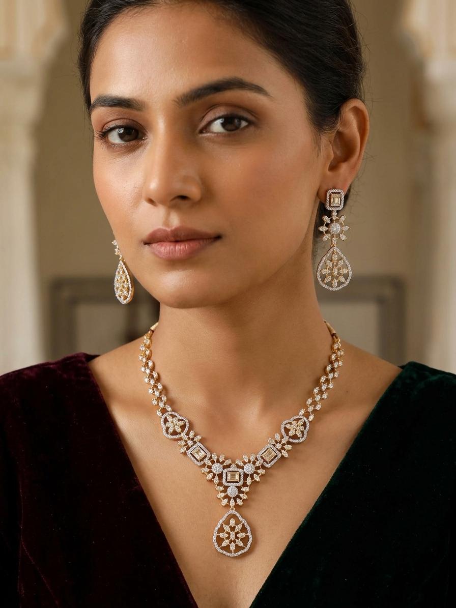 The focal point of this set is undoubtedly the intricately designed necklace. It gracefully drapes around the neck, its 10-inch length perfectly accentuating the décolletage. The design features a symmetrical arrangement of floral motifs, interspersed with meticulously placed stones. The combination of floral shapes and geometric forms creates a visually stimulating and elegant aesthetic. At the necklace's centre, a teardrop-shaped pendant hangs delicately, adding movement and drawing the eye with its captivating sparkle. The matching earrings complement the necklace beautifully. Each earring, measuring 1.9 inches in height and 0.8 inches in width, mirrors the necklace's design elements, echoing the floral motifs and sparkling stone settings. Their delicate dangle adds a touch of playful charm while maintaining an air of sophisticated grace. The secure clasps ensure comfortable and confident wear throughout the day or night.