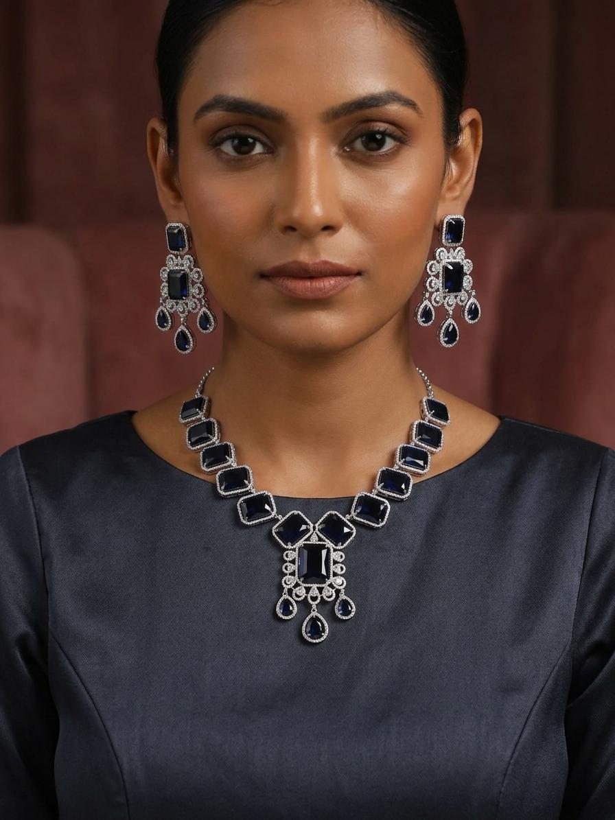 Stunning Silver Tone Stone Studded American Diamond Necklace Set With Earrings