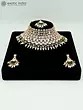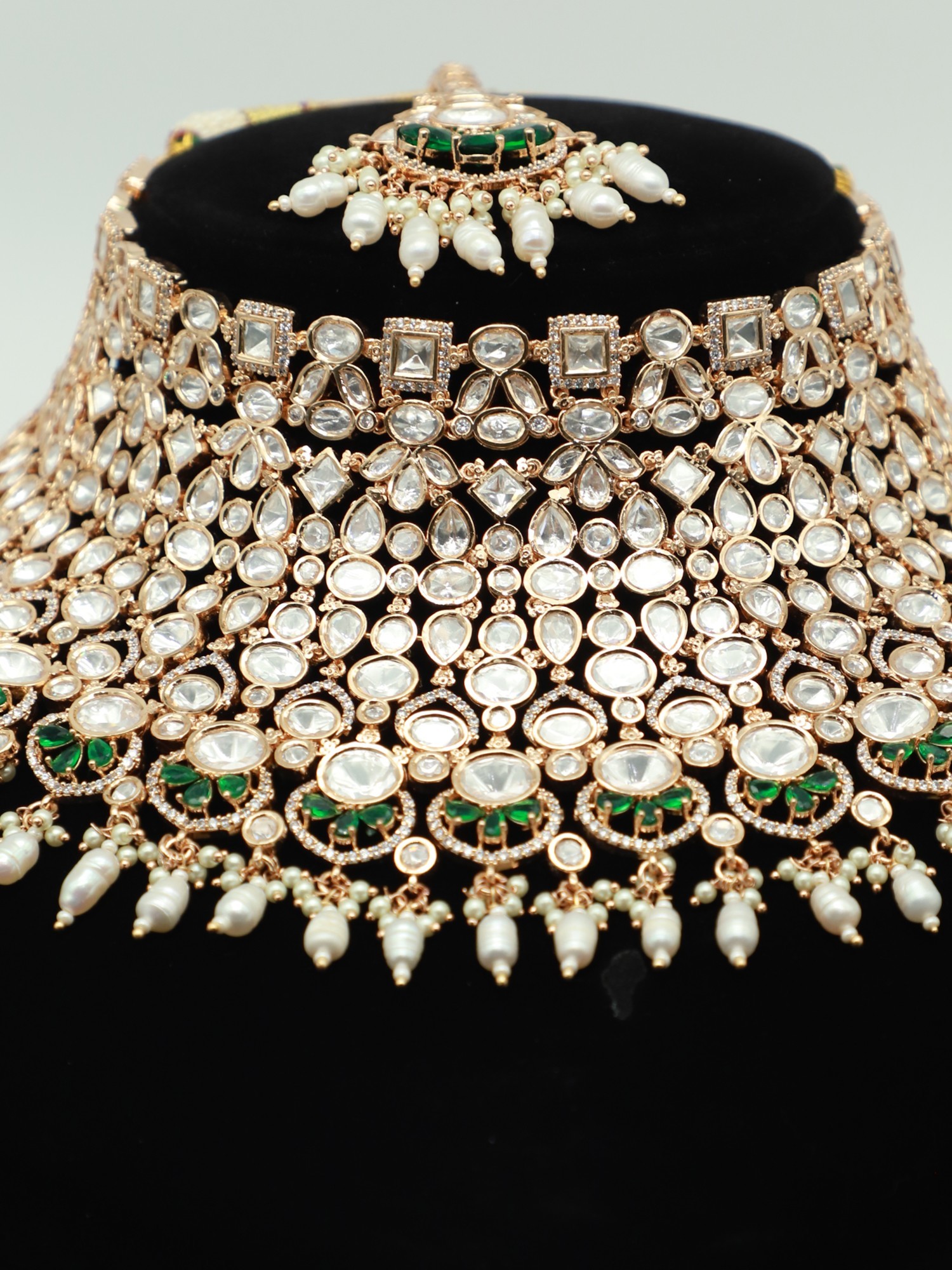 The focal point of this jewelry set is undoubtedly the choker necklace, featuring a mesmerizing pattern of stones. Delicate beadwork enhances the overall design, adding a touch of charm and dimension. Each detail, from the precise placement of the stones to the intricate arrangement of beads, speaks to the artistry and dedication involved in its creation. The matching earrings echo the design of the necklace, creating a cohesive and harmonious look. Their graceful silhouette will beautifully frame the face, catching the light with every movement. The set is completed with a coordinated mangtika, designed to adorn the forehead and add a final flourish of elegance to the overall ensemble.