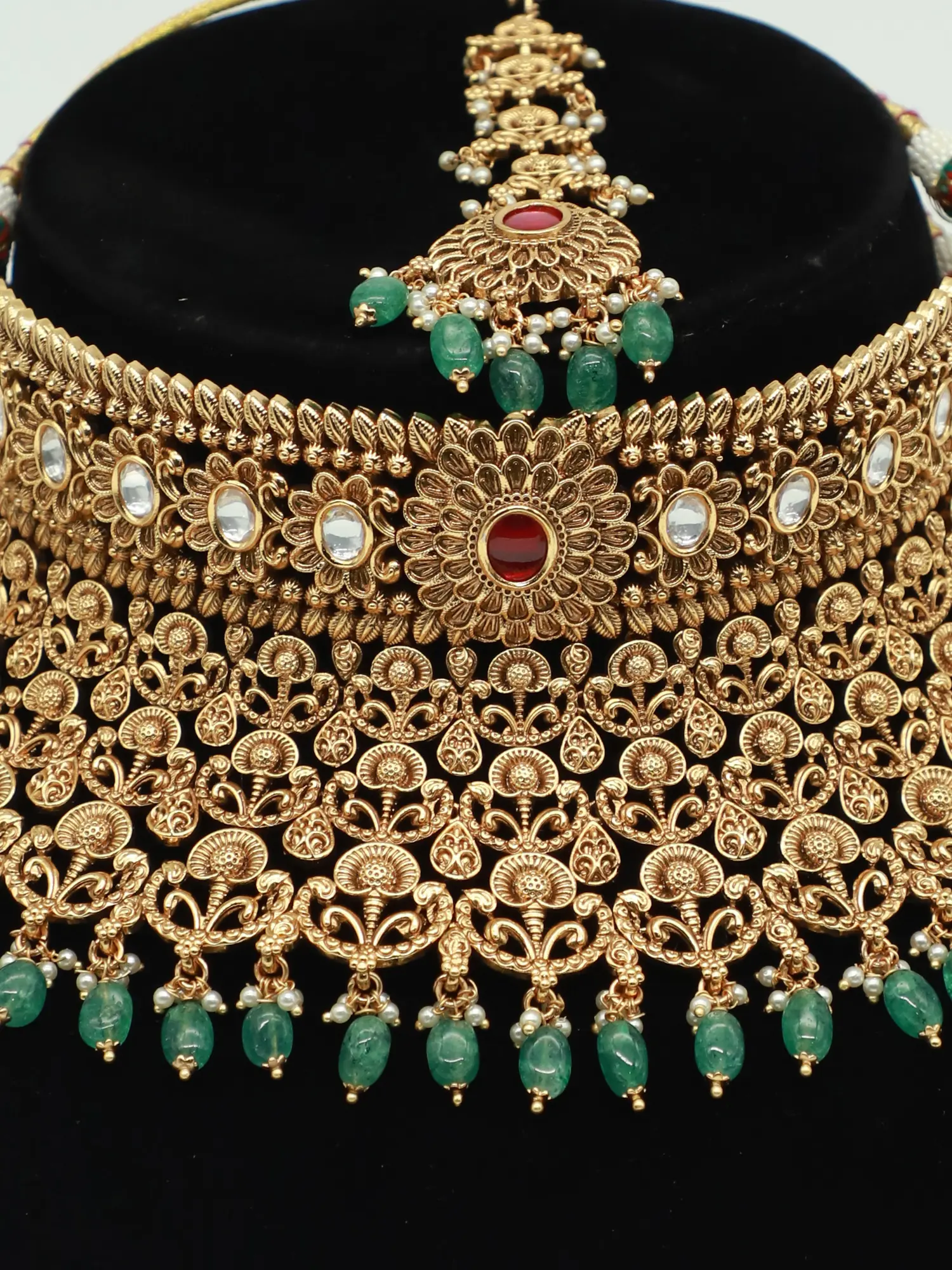 Stone Studded Choker Necklace Set with Earrings and Mangtika