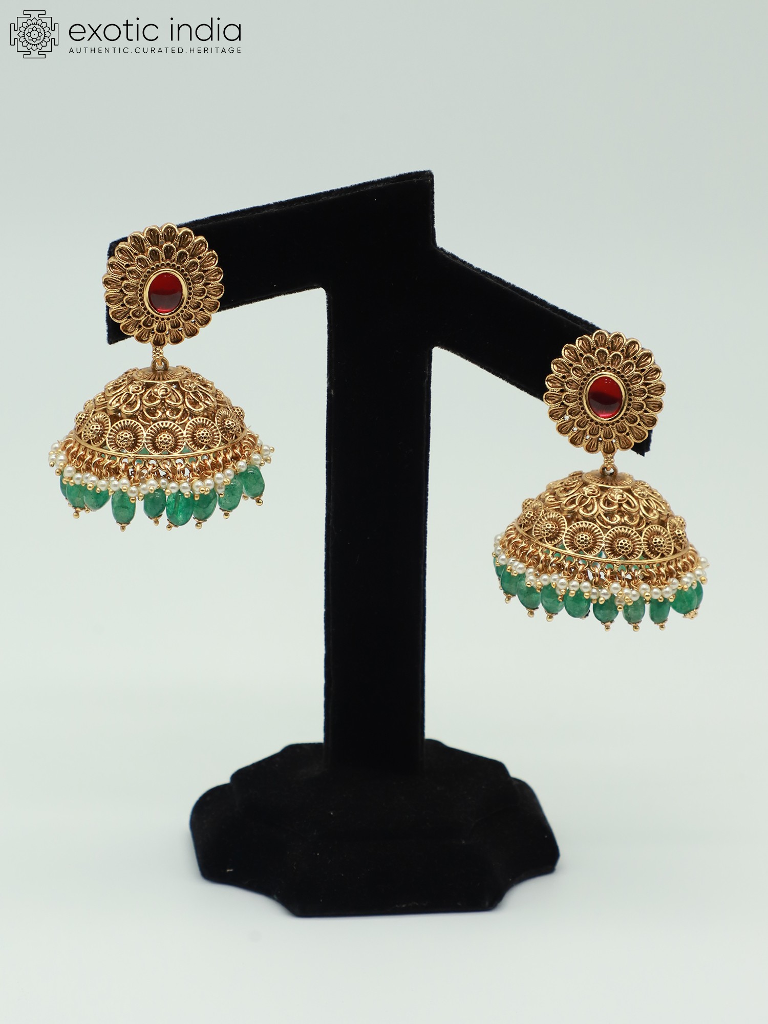 Brass Necklace Set With Kundan Studded Earrings And Hanging Beads