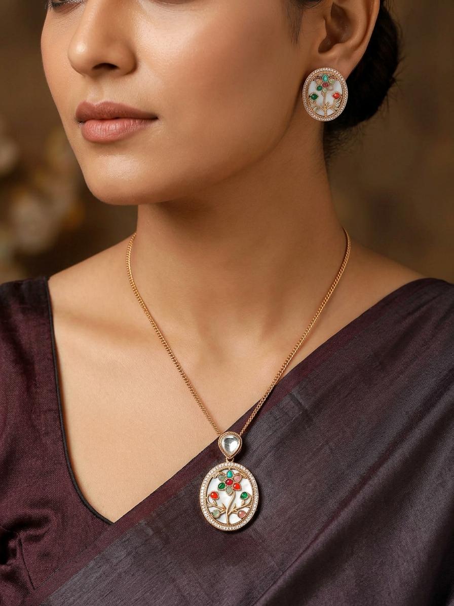 This exquisite pendant set is a true masterpiece, blending traditional craftsmanship with contemporary style. The intricate design features a captivating floral motif, meticulously crafted with vibrant multicolored stones that shimmer and catch the light. The pendant's circular frame is elegantly detailed, enhancing the overall beauty and sophistication of the piece. The matching earrings perfectly complement the pendant, creating a harmonious and stylish ensemble that is sure to turn heads.