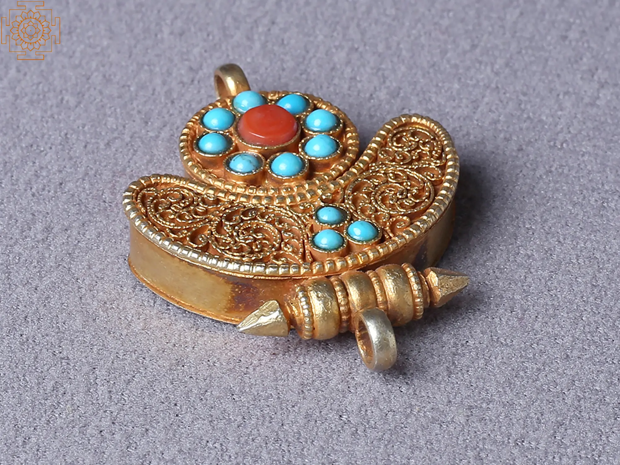 A small amount of turquoise stones are placed in the form of a flower with a central red stone to enhance the look of the pendant. The pendant is casket-shaped with two small compartments to keep scrolls or written prayers. This pendant is a beautiful piece of jewelry that can also provide the wearer with the comfort of prayers that shield them from all forms of negative energies.