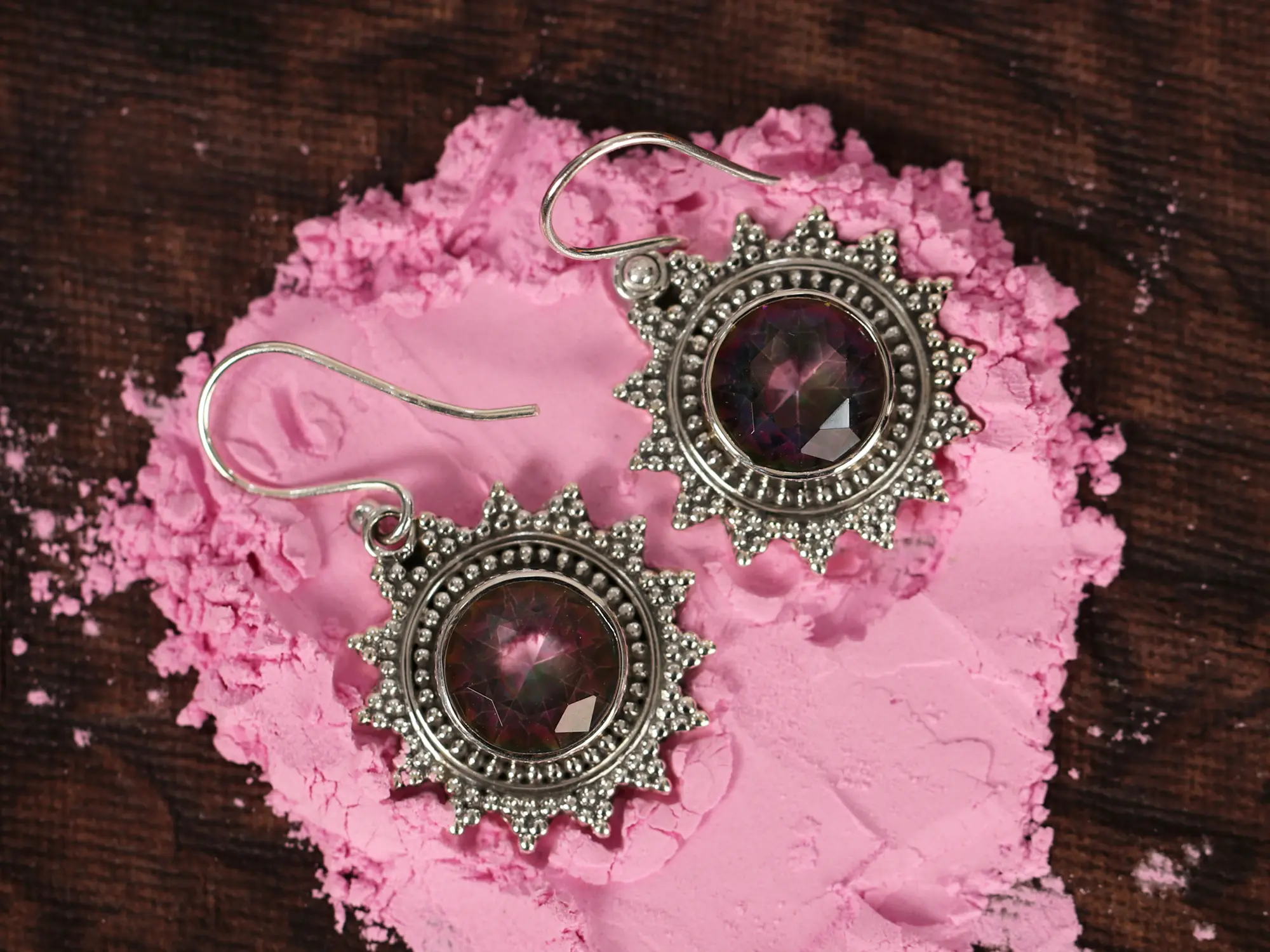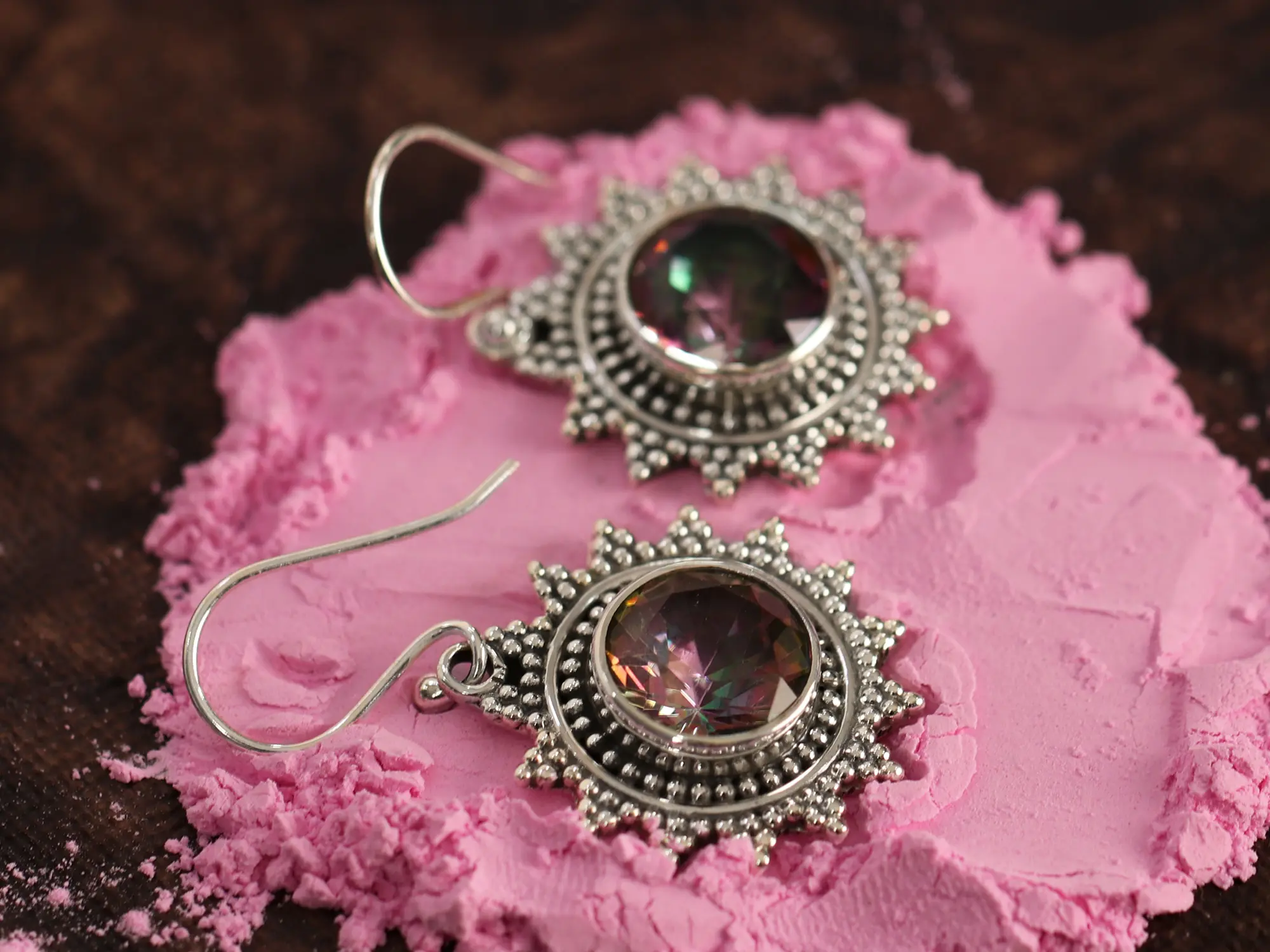 Cradled in sterling silver, these sun-shaped earrings with mystic topaz centers are a testament to the dance between light and matter. The gemstones, alive with an iridescent fire, hold within them an aurora of colors, reminiscent of dawn's first light captured in crystal. These topaz stones are known for their grounding properties, believed to bolster the spirit and calm the mind, while their ever-changing hues encourage a journey of self-discovery. Not merely adornments, they are silent guardians that carry the promise of balance, reflecting life's beauty back to the eyes of the beholder. Wearing them is like carrying your own personal dawn, a reminder that every day holds the potential for magic and new beginnings.