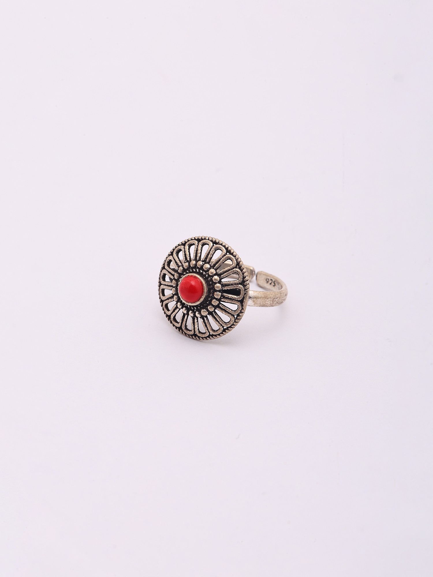 The design features a captivating sunflower motif, its delicate petals radiating outwards from a vibrant, central gemstone. This bold splash of color offers a striking contrast to the cool tones of the silver, creating a focal point that is both energetic and sophisticated. The adjustable band ensures a comfortable and secure fit, adapting effortlessly to your preference.