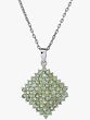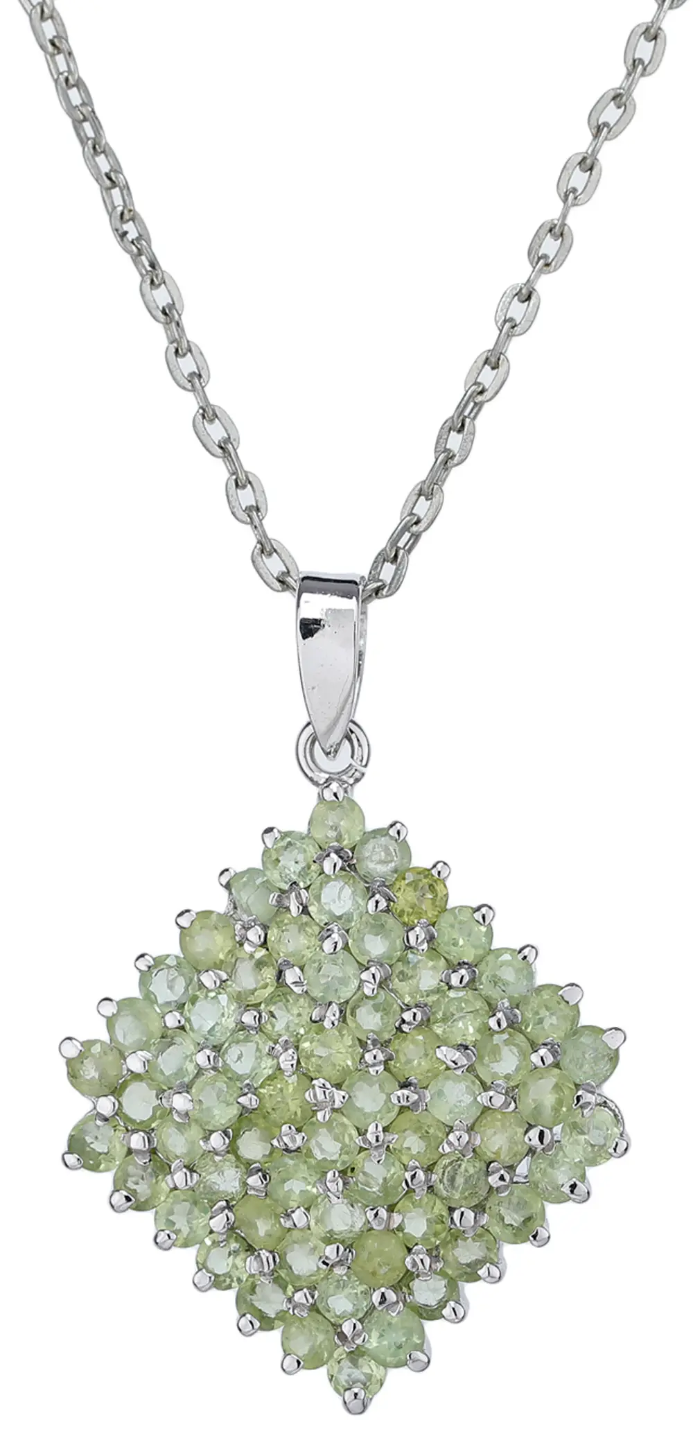 At the heart of this pendant lies a generous cluster of finely cut peridot gemstones. Known for their distinctive lime-green hue, peridots evoke the freshness of spring meadows and the vitality of new growth. The stones are arranged in a masterful mosaic, forming a geometric pattern that draws the eye and creates a sense of depth and dimension. The varying shades of green within the cluster add a subtle complexity, highlighting the unique character of each individual peridot. The way the light dances across the many facets of these stones creates a mesmerizing sparkle that is truly enchanting. This piece is a testament to the beauty and allure of peridot, offering a touch of natural elegance to your style.