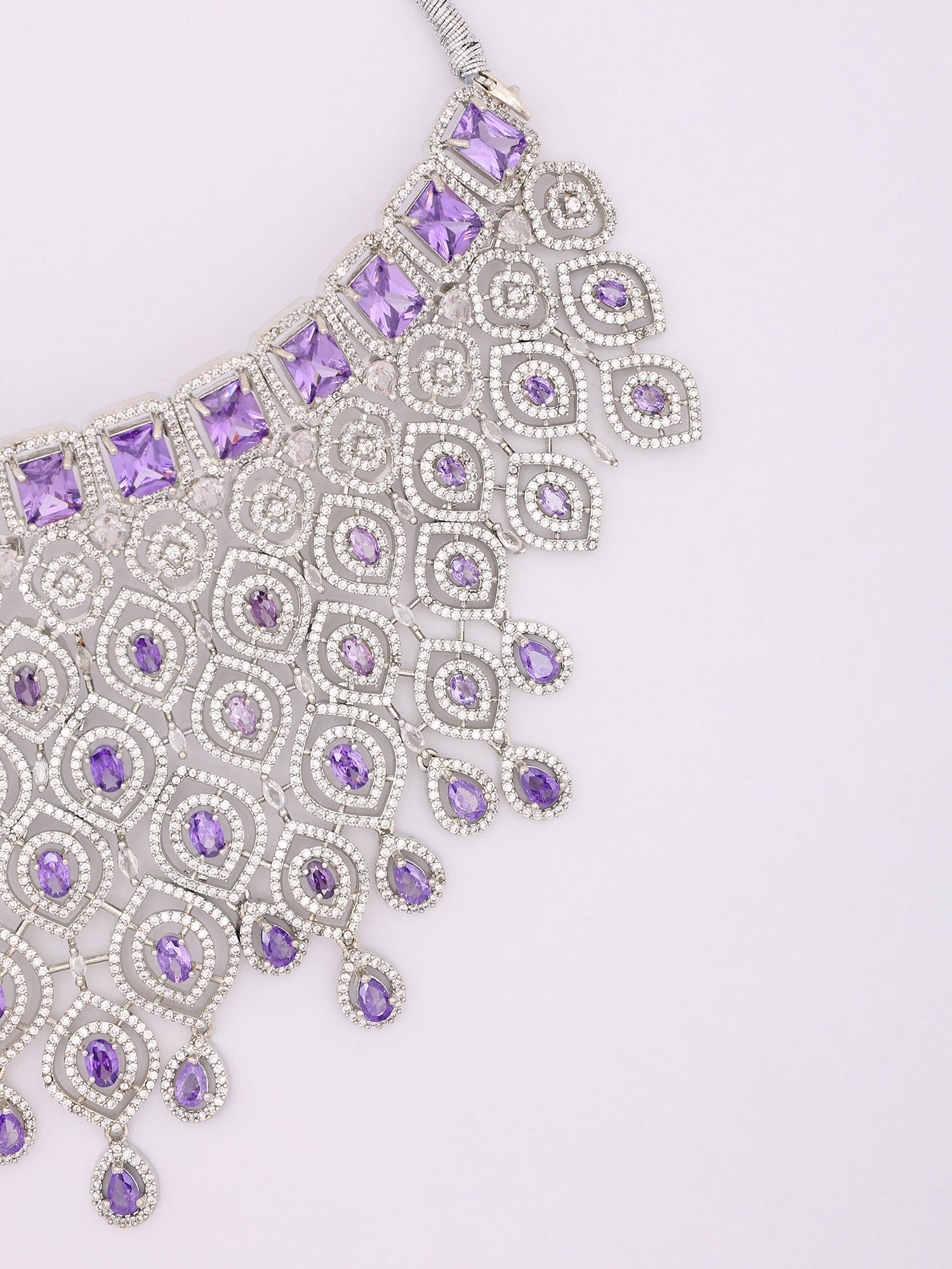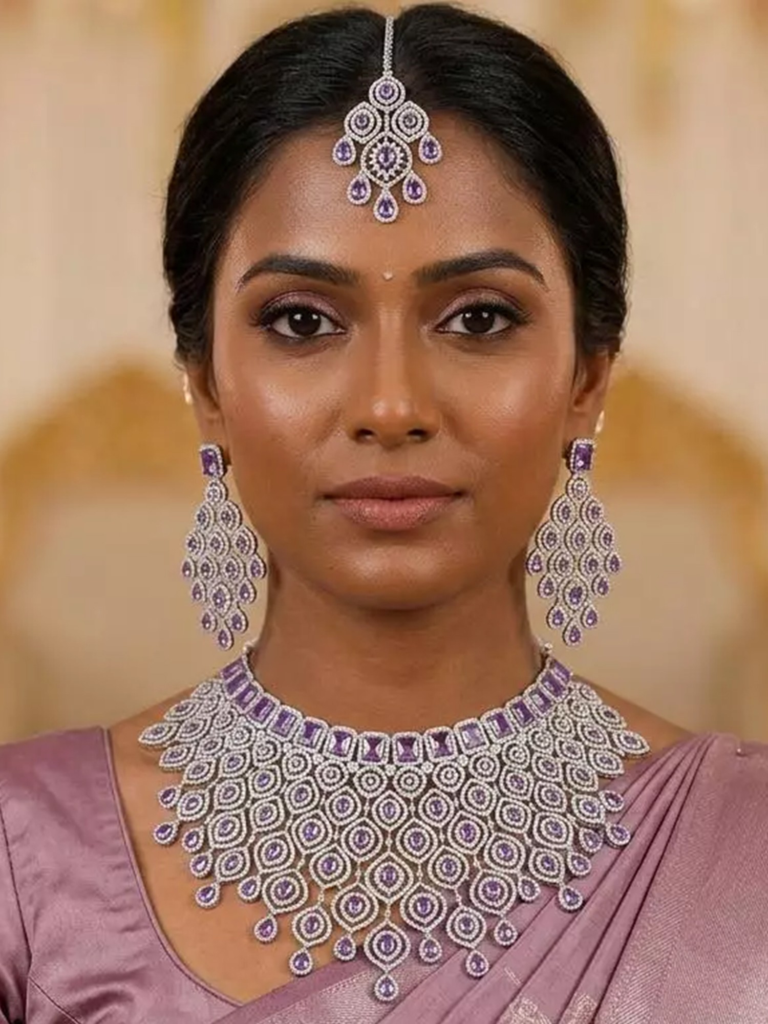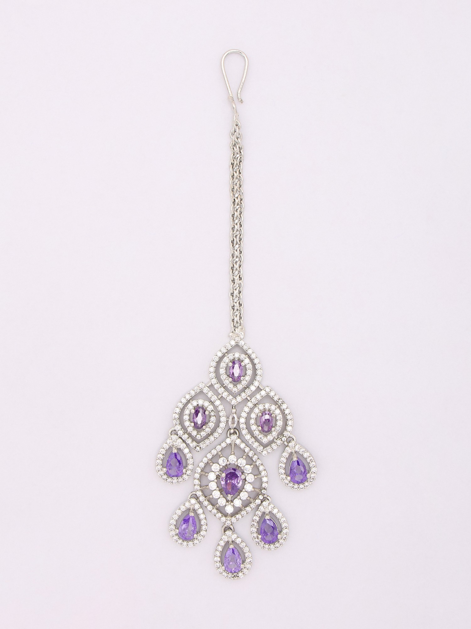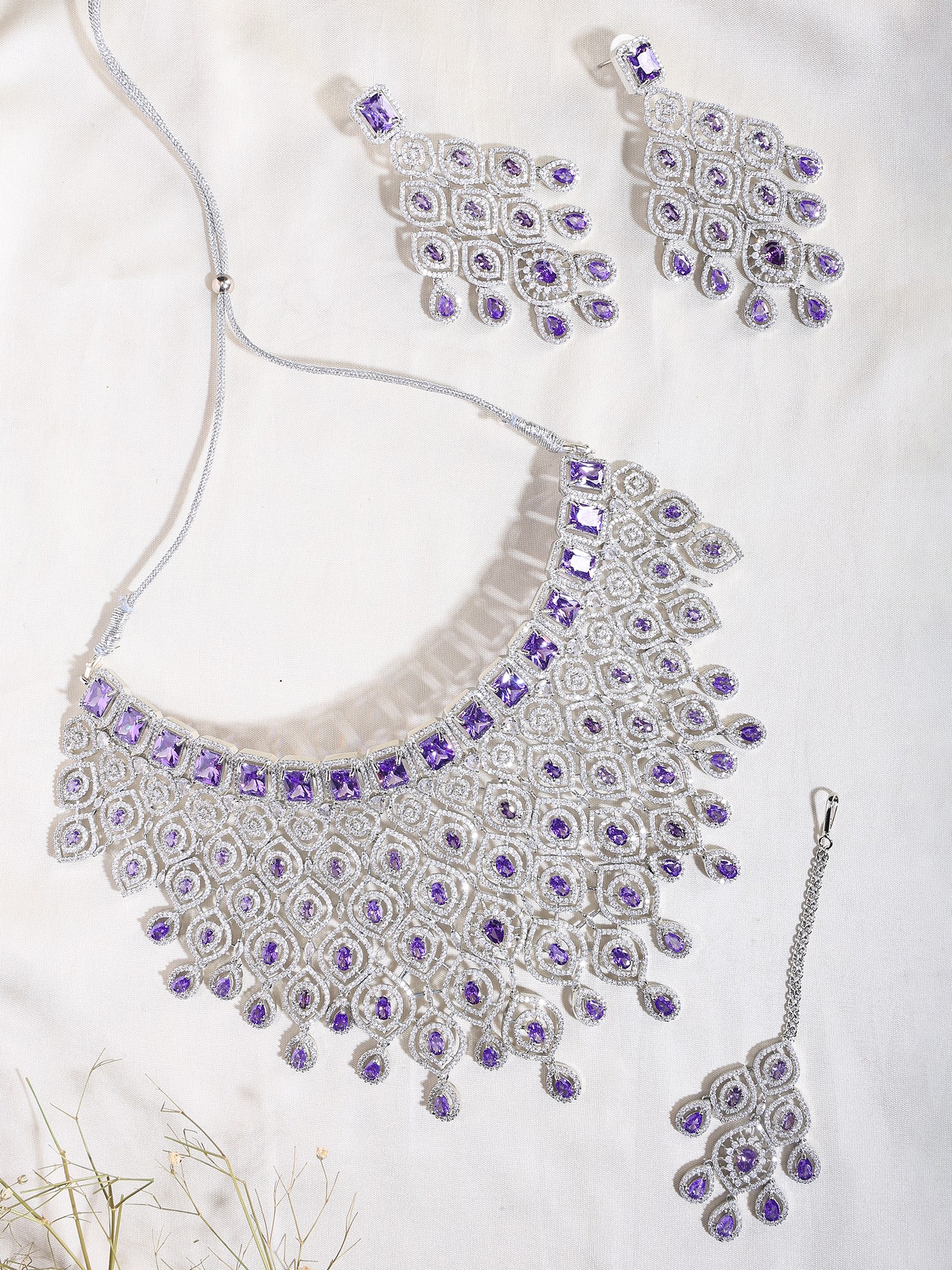 Superfine Royal Purple American-Diamond Bridal Necklace Set with Mangtika