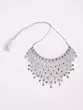 Adorn yourself with the captivating glow of the necklace, a masterpiece designed to gracefully rest at a height of 4 inches with an adjustable dori for a perfect fit. Complementing its grandeur are the earrings, each measuring a striking 3.50 inches in height and 1.65 inches in width, designed to sway elegantly with your every movement. The accompanying maang tikka, with its delicate 4.55-inch length, adds a final flourish of sophistication, drawing the eye with its symmetrical beauty and the vibrant hue of its royal purple accents.