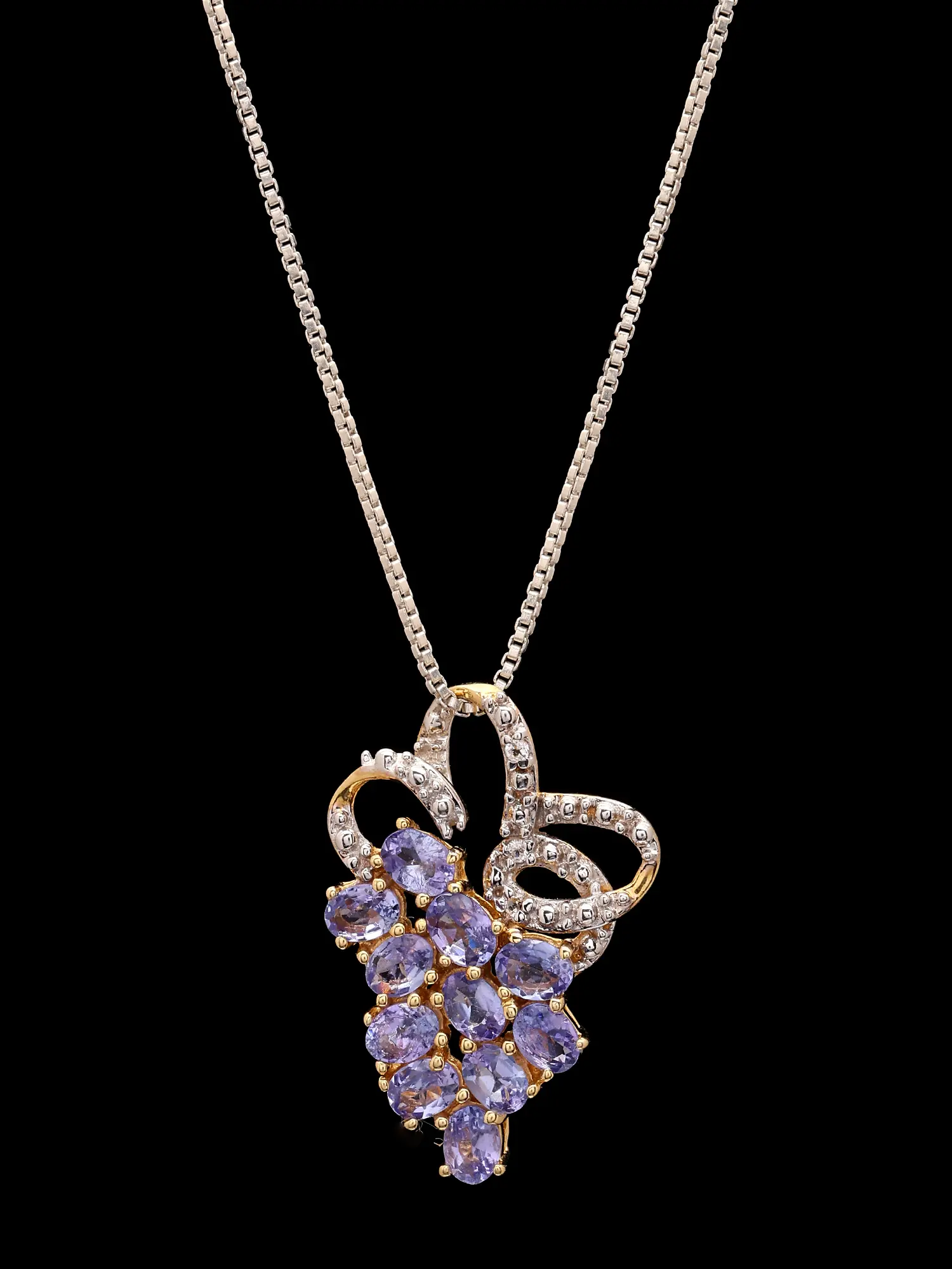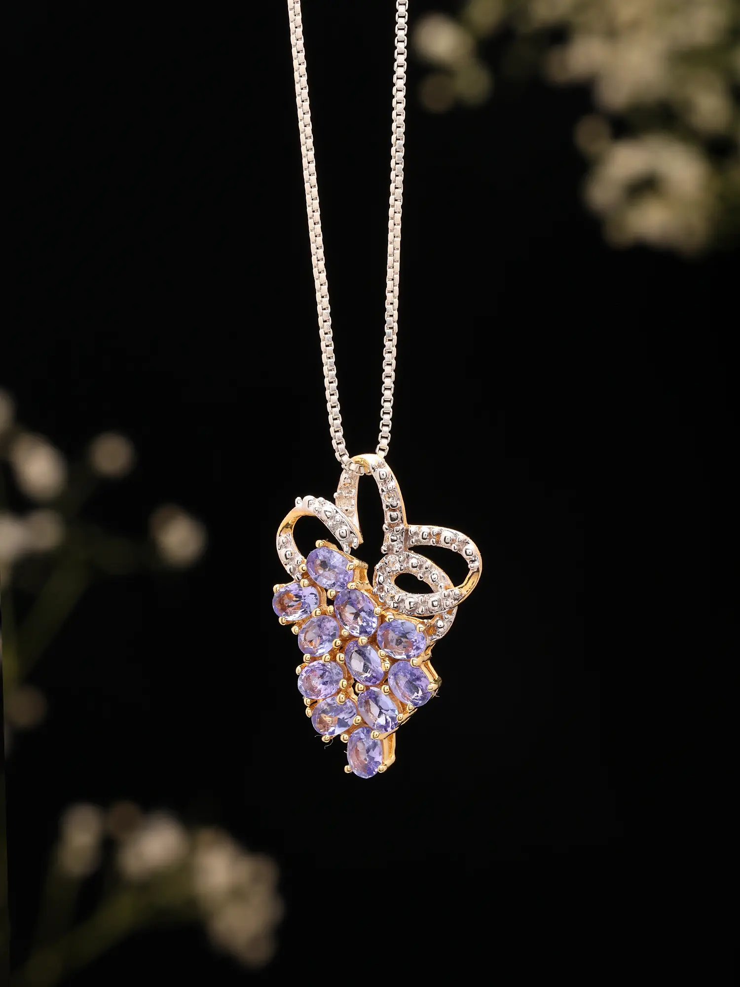 Discover a truly captivating piece that blends the ethereal beauty of nature with masterful craftsmanship. This exquisite pendant, rendered in gleaming sterling silver, is a testament to sophisticated design. It features a cluster of oval-cut tanzanite gemstones, evoking the lush abundance of a ripe grape bunch. Each tanzanite stone displays a mesmerizing violet-blue hue, a color reminiscent of twilight skies and precious jewels, promising to enchant with every glance. The faceted cuts of these gemstones catch and refract light beautifully, creating a dazzling display that dances with brilliance.