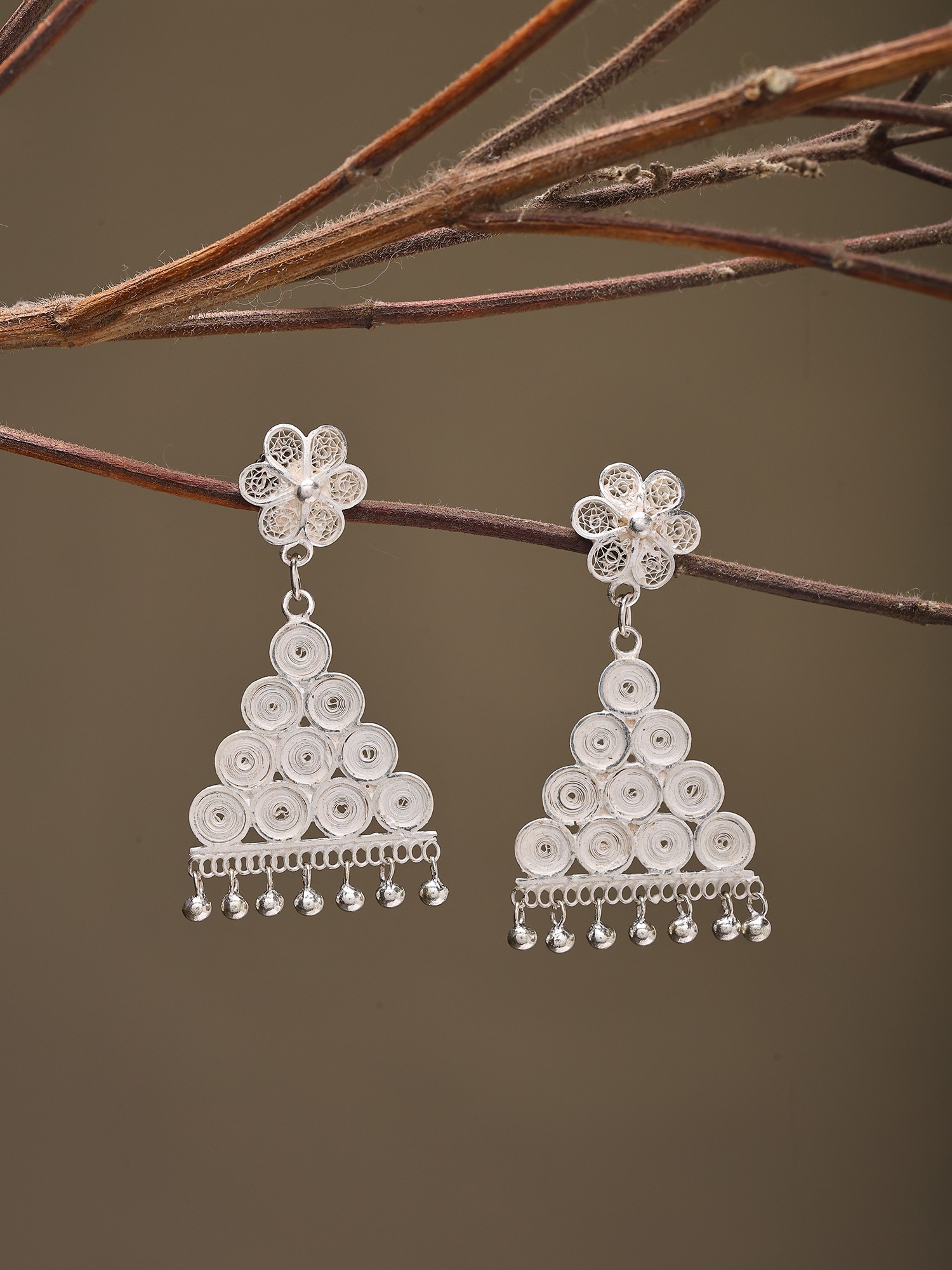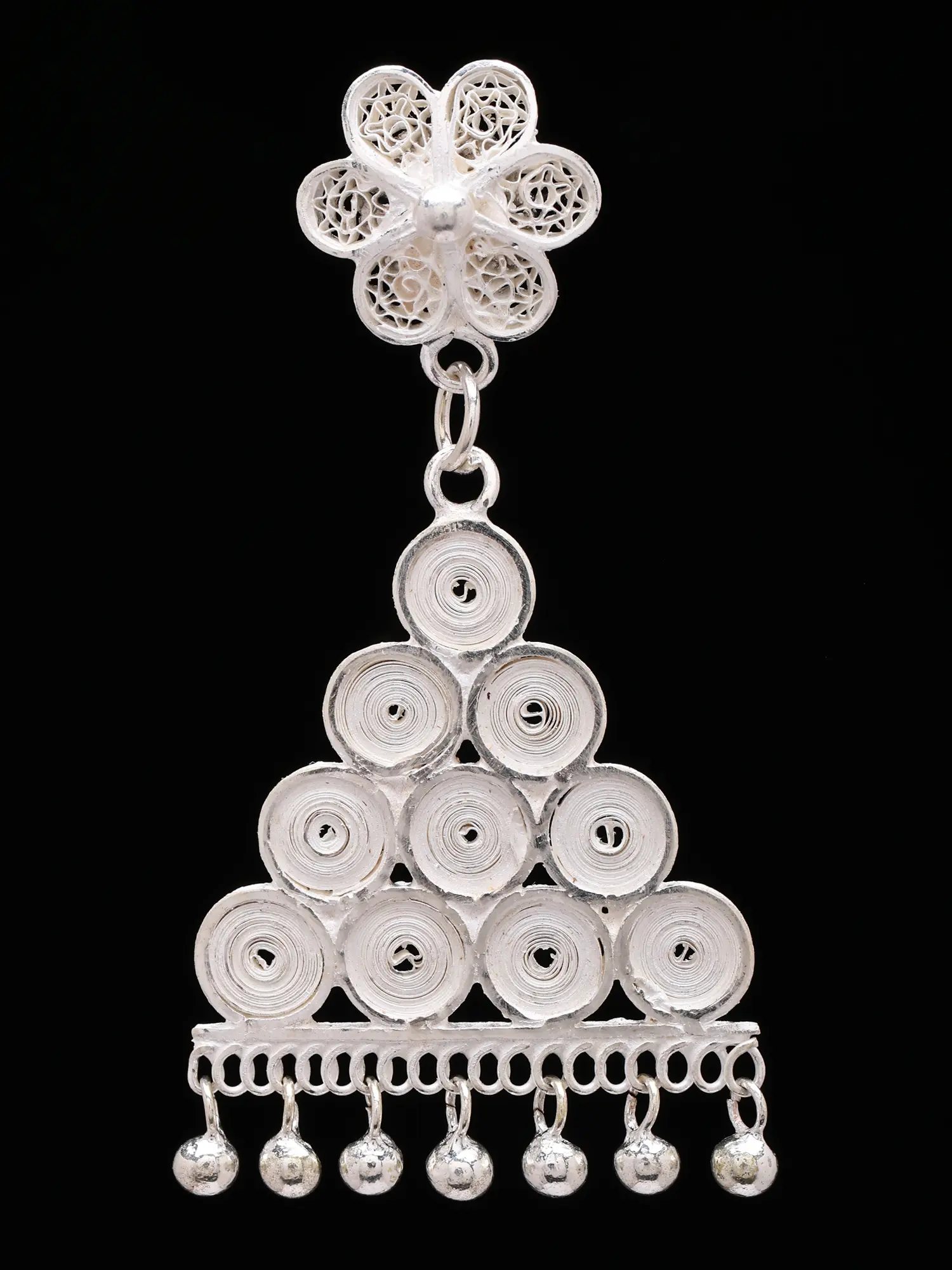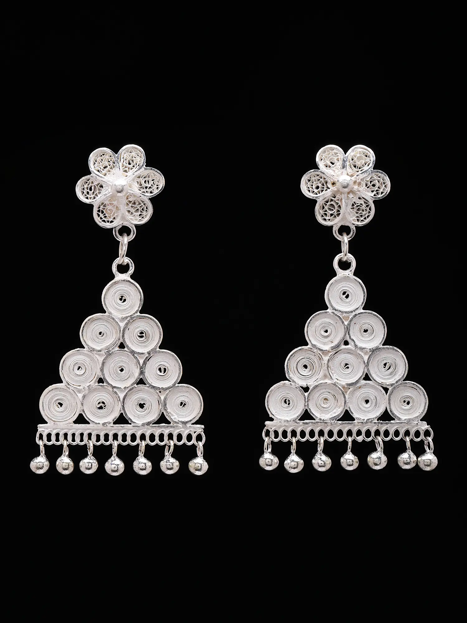 These earrings present a captivating interplay of form and texture. A delicate, openwork floral motif serves as the foundation, seamlessly transitioning to a striking triangular cascade. The cascading section is composed of numerous tightly wound silver coils, creating a rich, textured appearance that catches the light beautifully. A charming fringe of tiny, polished silver spheres gracefully dangles from the bottom, adding a subtle, rhythmic movement with every turn of your head. Their overall height of 1.85 inches and width of 0.95 inches creates a noticeable yet refined presence.