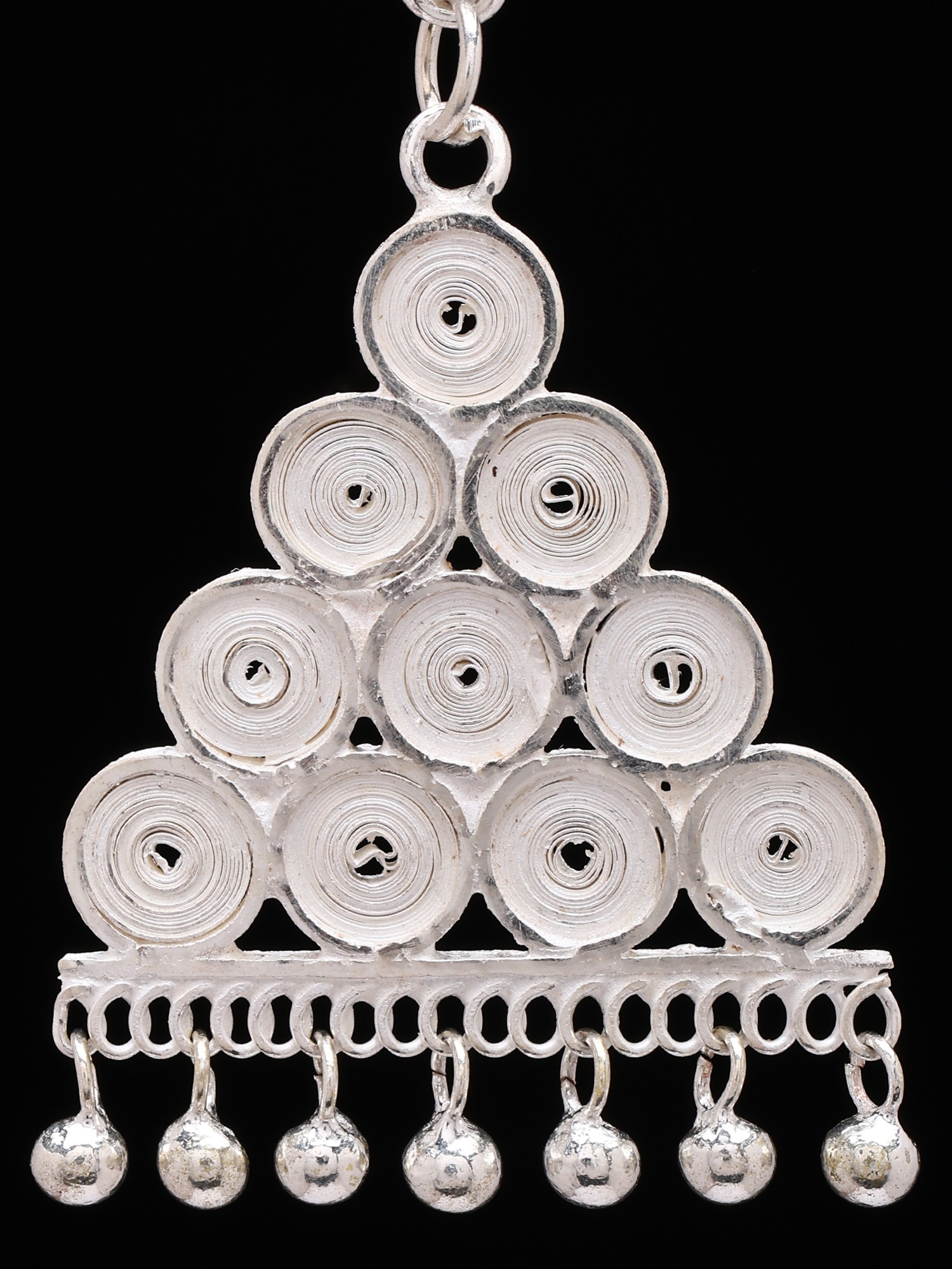 A unique triangular cascade design showcases coiled silver strands for texture.