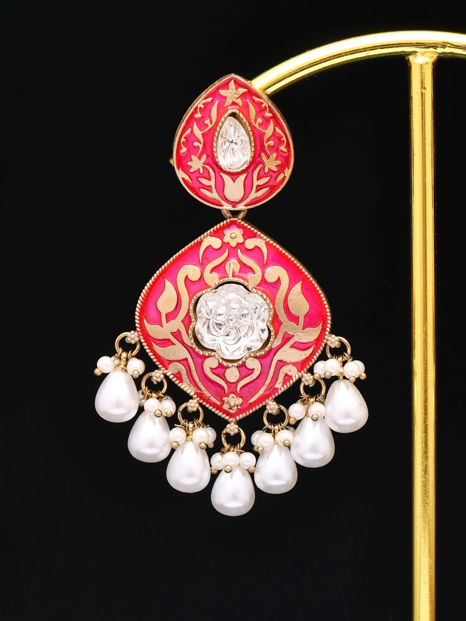 Intricate Meenakari style enamelwork adorns the teardrop design.