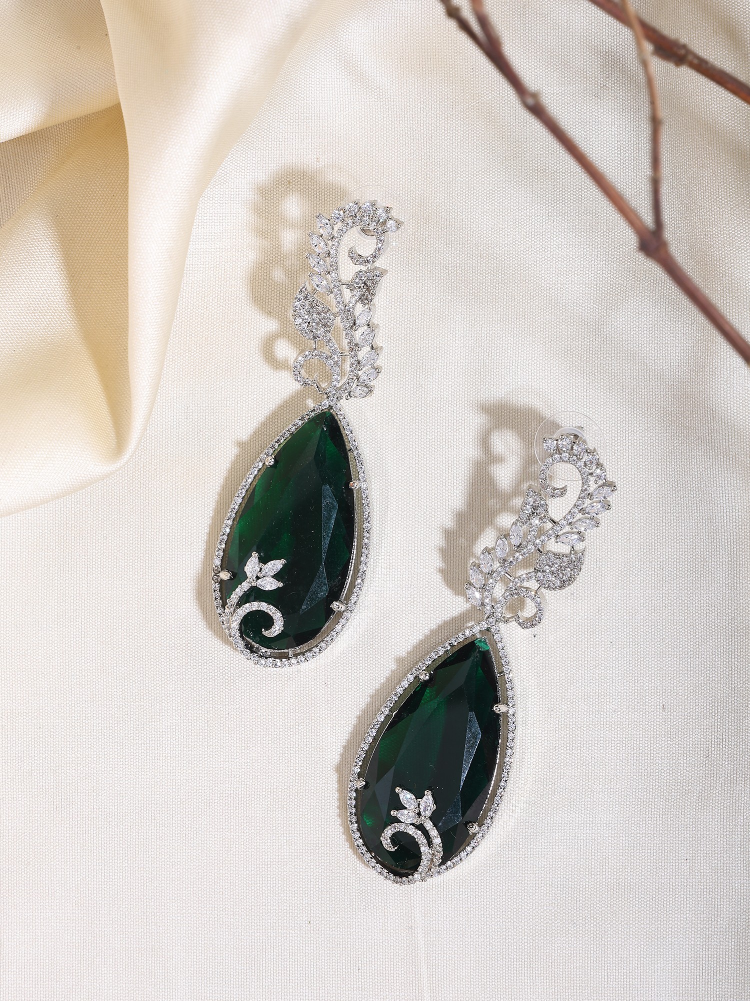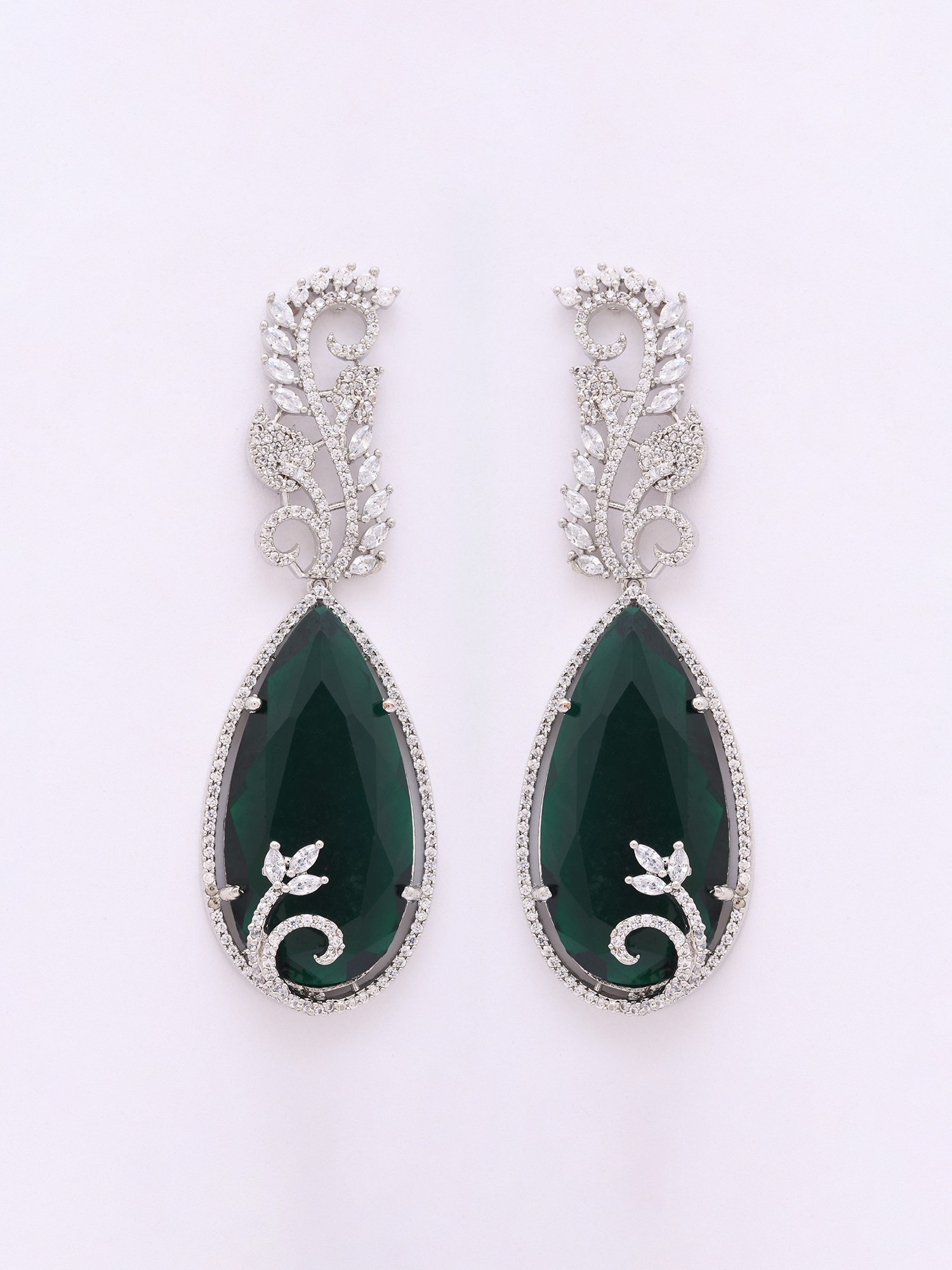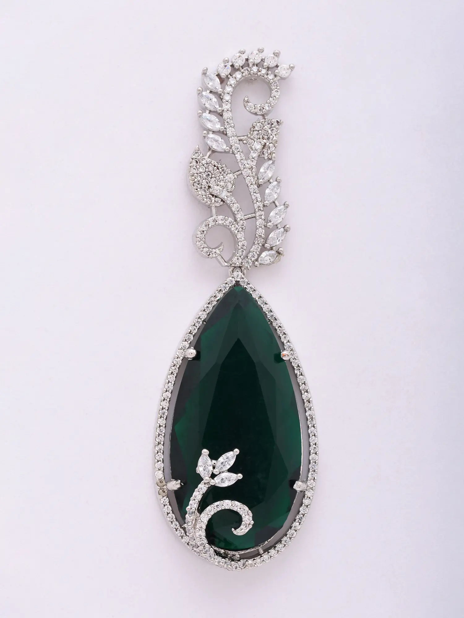 The design features a striking, teardrop-shaped gemstone in a deep, captivating green, reminiscent of the most precious emeralds. Encircling this central jewel and forming the ornate top is a cascade of micro-set American diamonds, each catching the light with remarkable intensity. The overall length, approximately three inches, provides a graceful sweep, while the width of just under an inch ensures a statement without overwhelming. The interplay of the brilliant white diamonds against the rich green stone creates a visually arresting composition that draws the eye and commands attention.