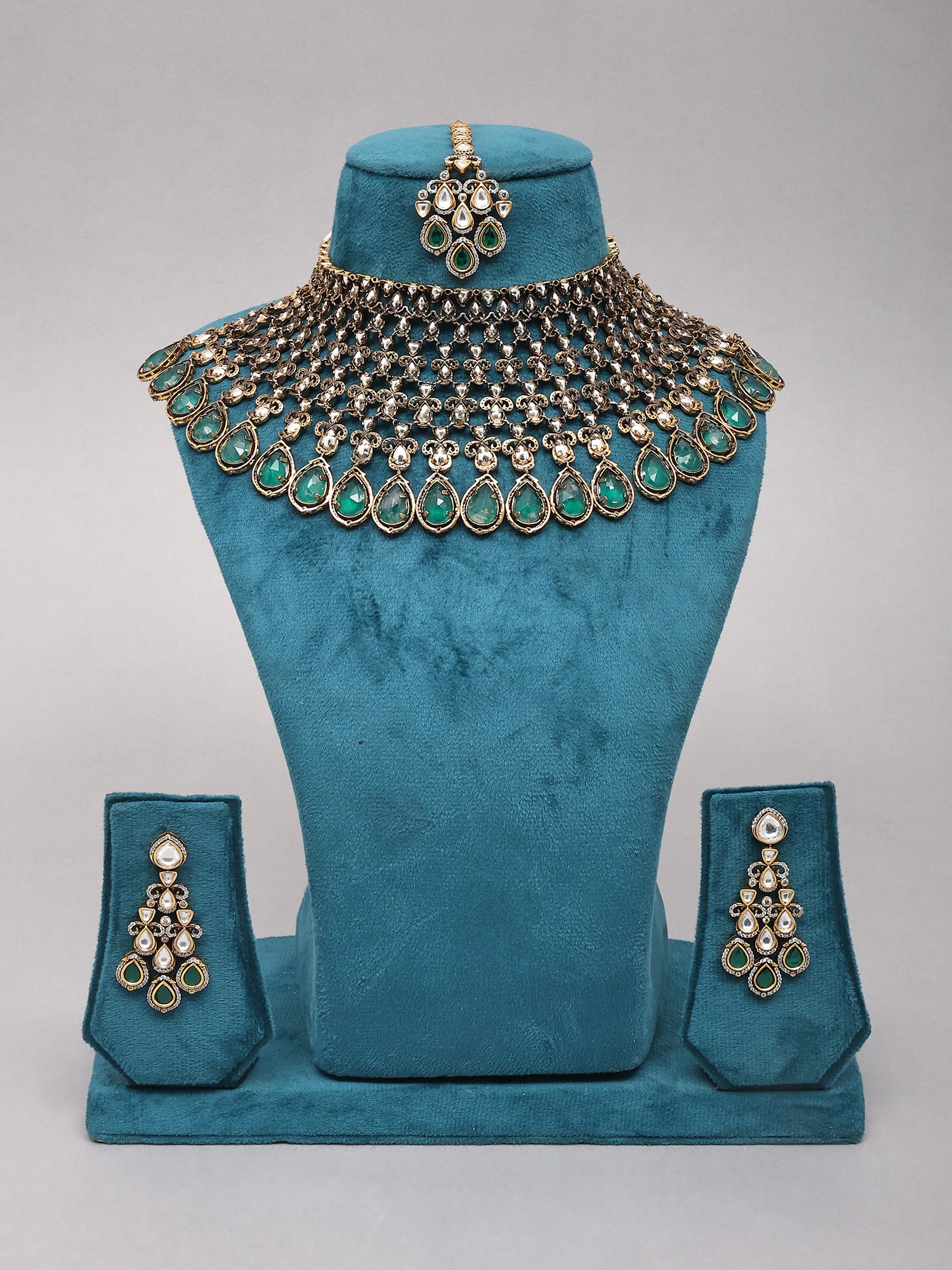Teardrop Stone Studded Kundan Bridal Necklace Set with Earrings and Maang Tikka