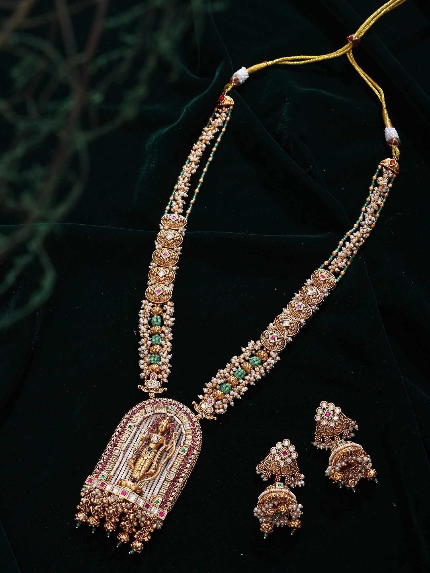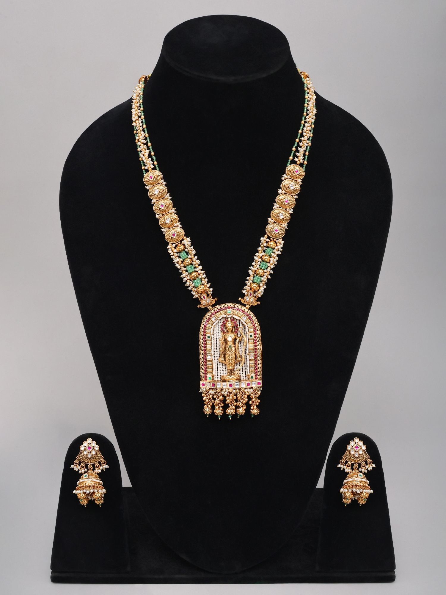 This ensemble draws inspiration from ancient temple jewelry traditions, where each piece served not only as adornment but also as an object of reverence and cultural significance. The portrayal of deities and the use of symbolic motifs are deeply rooted in spiritual and artistic heritage, offering a connection to centuries of devotion and craftsmanship. Wearing this set is like carrying a piece of that profound history with you.