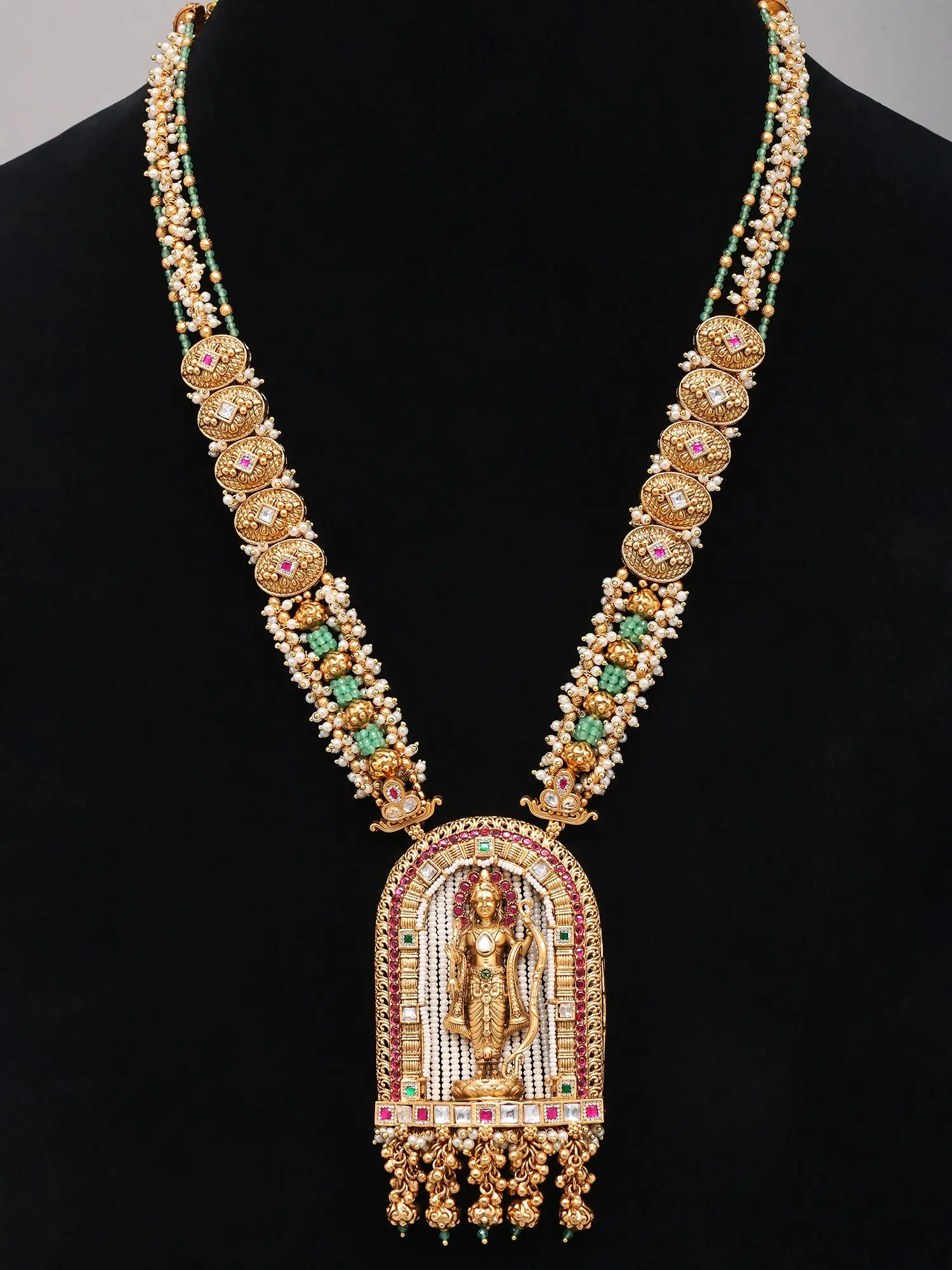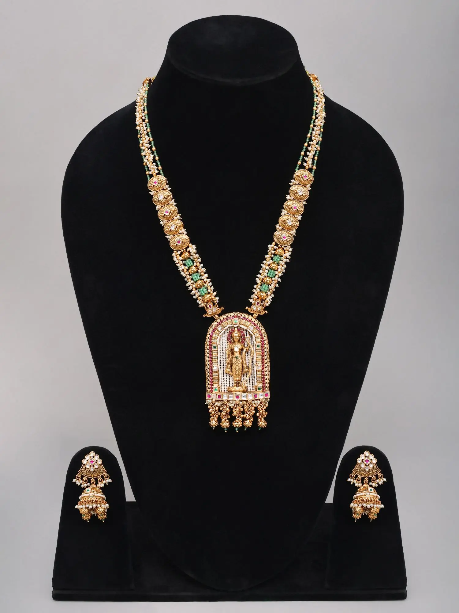 The captivating pendant, measuring 3.5 inches in length and 2 inches in width, showcases a finely detailed depiction of Lord Rama within a temple-inspired arch. This central motif is framed by a rich arrangement of vibrant gemstones and a cascade of small pearls and gold beads, creating a breathtaking visual spectacle. The necklace itself extends gracefully to 17 inches, perfectly complemented by matching earrings, each measuring 2 inches in length and 1 inch in width, featuring similar intricate detailing that echoes the pendant's grandeur.