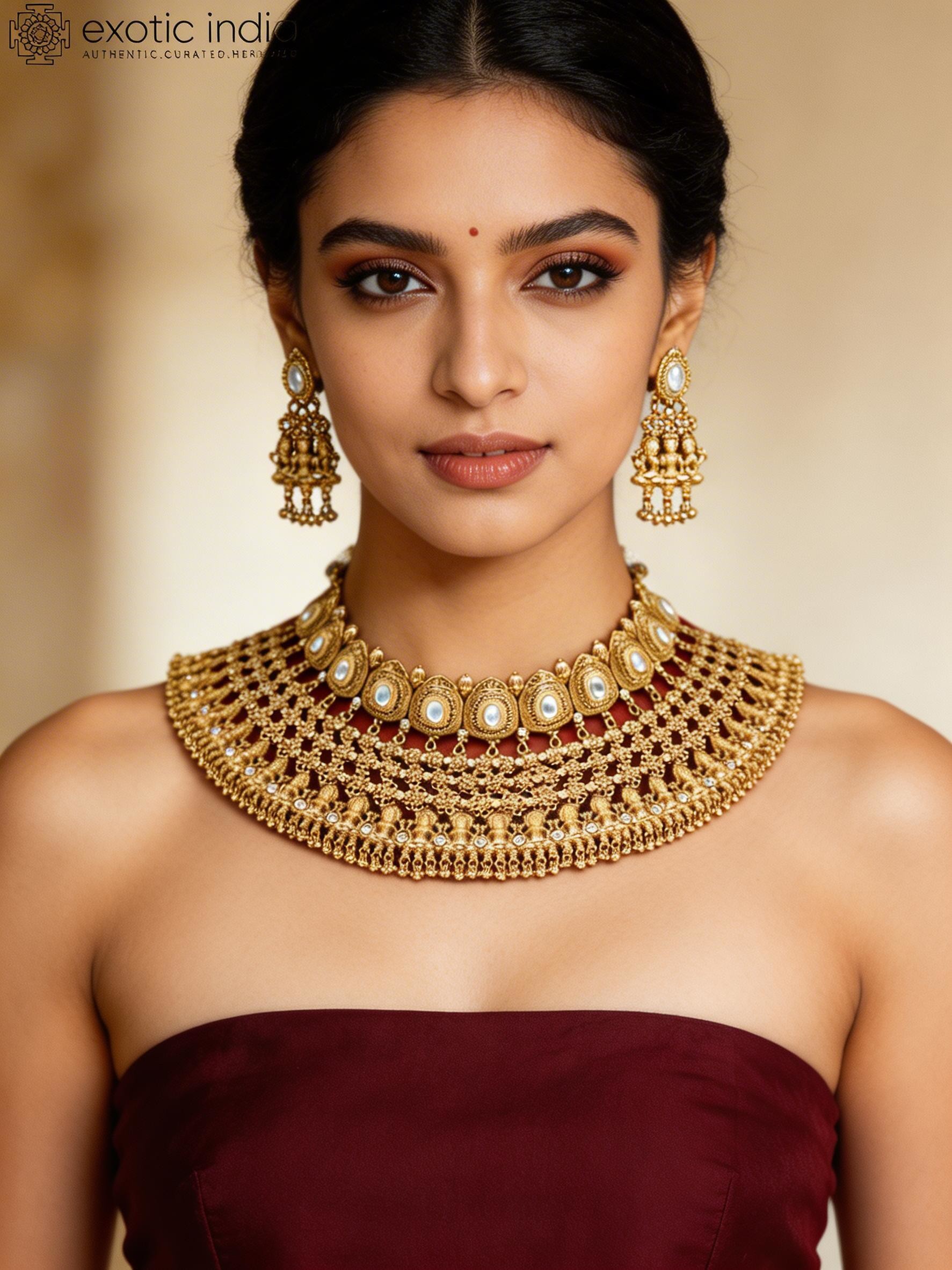 The choker design sits gracefully around the neck, making it a perfect complement to a variety of necklines. It is designed to be a focal point, drawing attention and admiration. The accompanying earrings mirror the necklace's design elements, creating a cohesive and harmonious look. The earrings' design offers a graceful movement with every turn of the head, ensuring you remain the center of attention. The use of high-quality brass ensures durability and longevity, allowing you to cherish this set for years to come. This jewelry is designed to stand the test of time, becoming a treasured heirloom that can be passed down through generations. It’s an investment in timeless style and enduring beauty. This set is perfect for those who appreciate the finer things in life and seek jewelry that reflects their refined taste. This set is an absolute must have in your wardrobe.