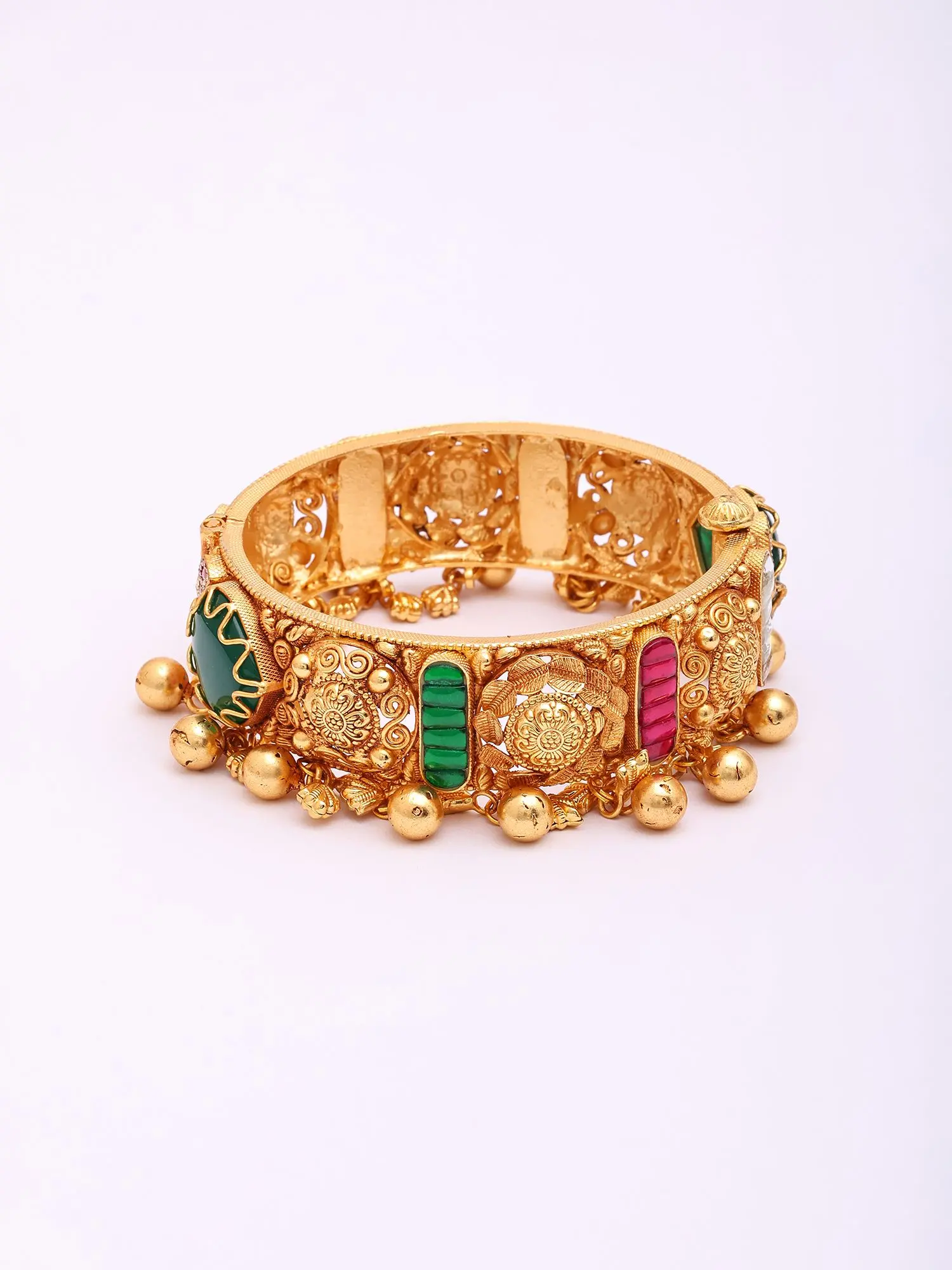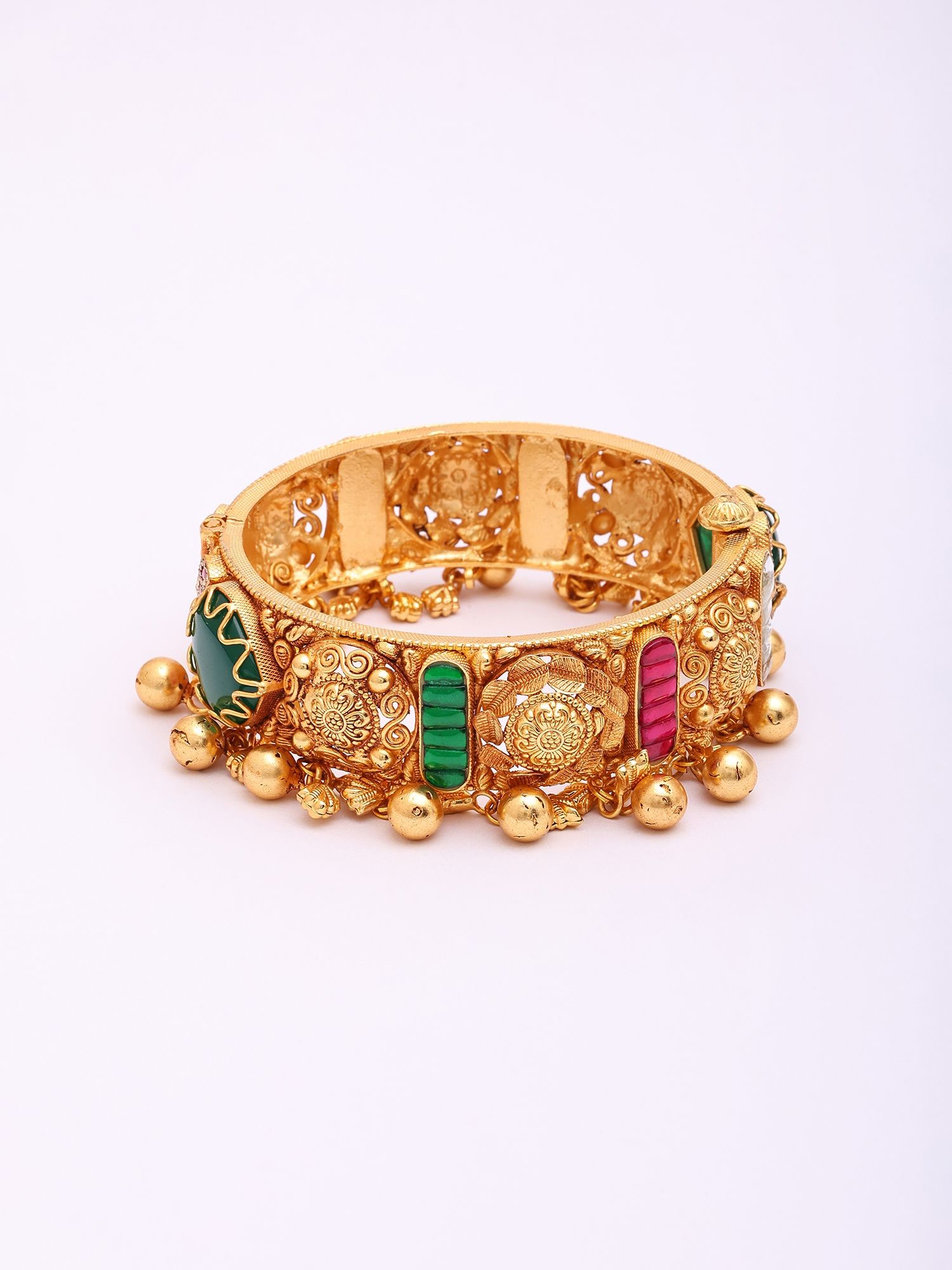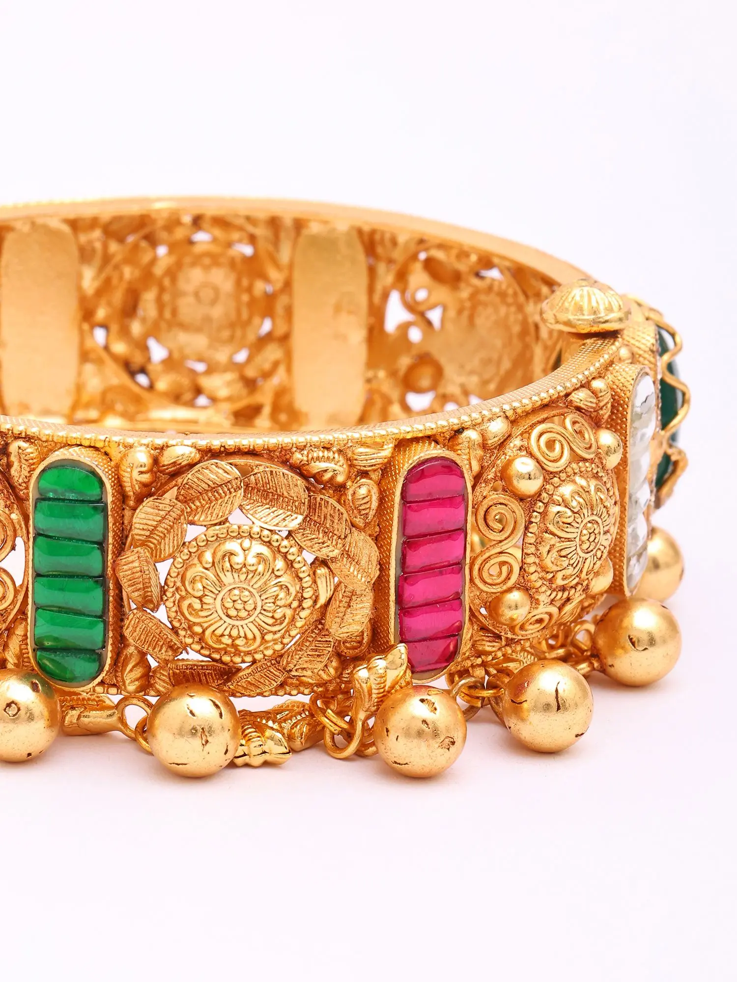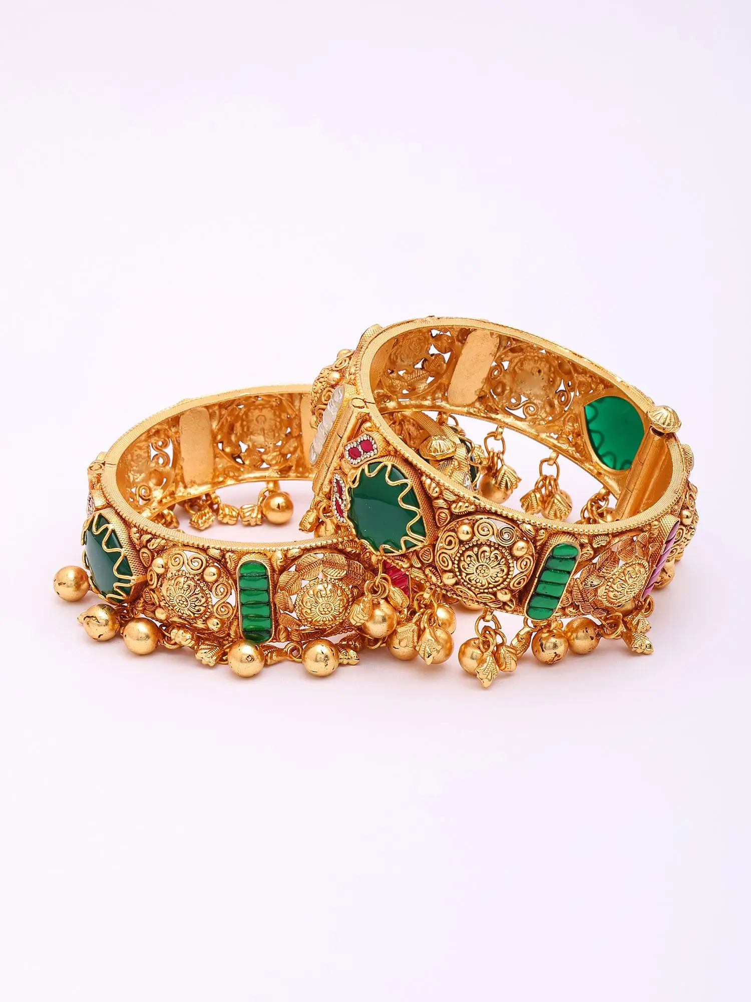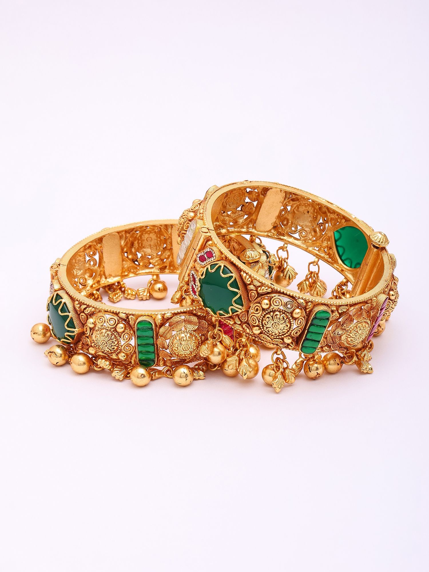 The visual allure of these bangles is undeniable, featuring vibrant Kundan accents that catch the light with every movement. The openable design ensures a comfortable and secure fit, while the ornate filigree work, interspersed with rich hues, adds a layer of captivating depth. Miniature bells hang delicately from the lower edge, producing a subtle, melodious chime that further enhances their charm.