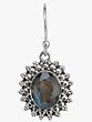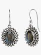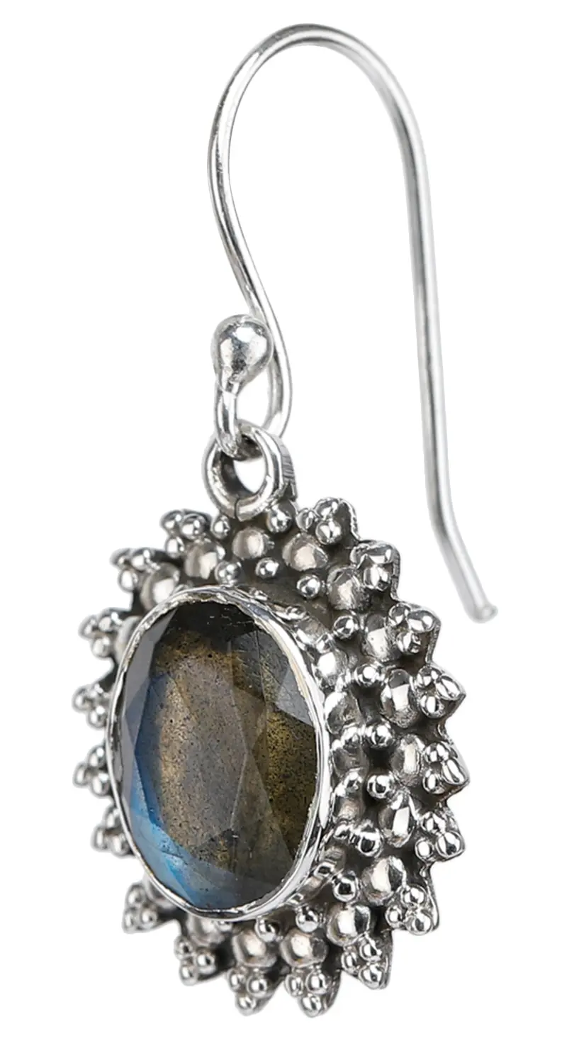 Each earring is meticulously set in high-quality sterling silver, a precious metal that complements the labradorite's inherent radiance. The sterling silver setting features a unique, textured halo around the gemstone, reminiscent of a bursting sun or a delicate floral bloom. This intricate detailing, achieved through skilled craftsmanship, adds depth and visual interest, creating a stunning contrast with the smooth, faceted surface of the labradorite. The sterling silver hooks are designed for comfortable wear and secure fastening, ensuring these treasures stay with you throughout your day.