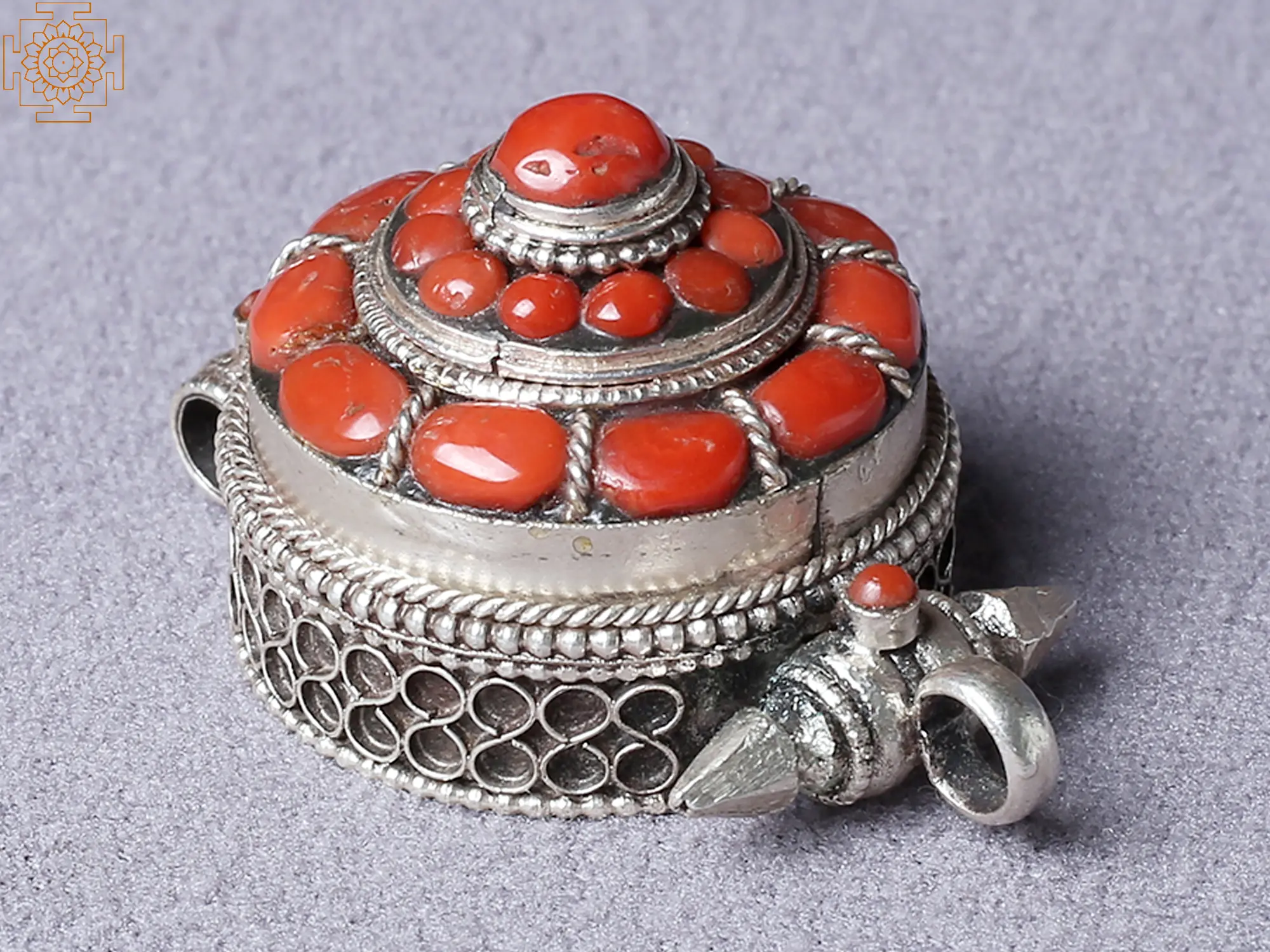 From portable shrines to small pendants the Ghau has come a long way. Initially worn across the waist, some Ghau pendants are now worn across the neck. This Three-Layered Round Tibetan Coral Ghau pendant from Nepal is made of silver. It carries the traditional design which consists of three layers. The first layer is of beautifully decorated coral face, the second layer is the wired ornamentation and the third layer is the casket or compartment to store the prayer scrolls. This Ghau pendant is a sacred amulet that can also work as casual jewelry. The Ghau is generally worn during festivals and matched with the color of the costume to complete the look.