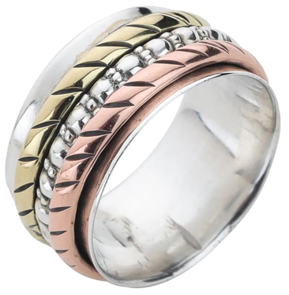 Discover a unique piece of artistry designed to bring you peace and focus. This exquisite spinner ring is more than just an accessory; it's a tactile tool for mindfulness and a beautiful statement of personal style. Crafted from high-quality sterling silver, this ring features a captivating three-tone design that adds depth and visual interest. The cool, classic sheen of sterling silver forms the base, providing a durable and lustrous foundation for the intricate moving bands.