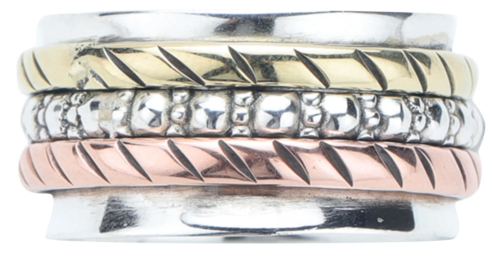 The beauty of this ring lies in its layered construction. A central band, rendered in a warm, radiant gold tone, is intricately etched with a pattern of small, angled cuts that catch the light with every movement. Adjacent to this, a textured band of sterling silver is adorned with a delicate pattern of small, perfectly round beads, offering a delightful tactile sensation. The outermost spinning band showcases a striking rose gold hue, also detailed with the same elegant angled-cut etching as the gold band. This harmonious blend of silver, gold, and rose gold tones creates a visually dynamic and sophisticated aesthetic.