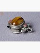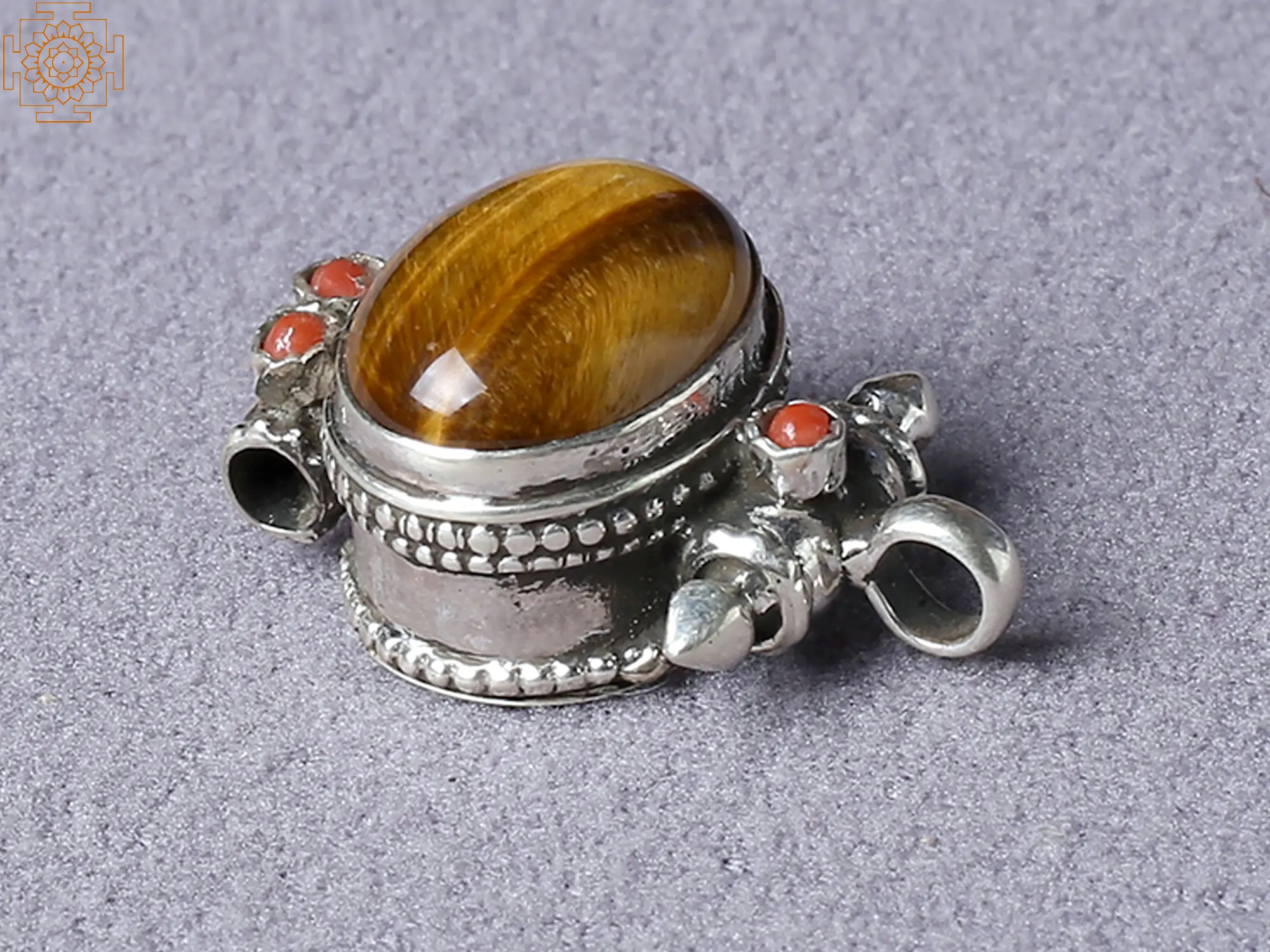This Tiger Eye Silver Pendant from Nepal is a Ghau pendant that has been designed keeping the traditional Ghau or portable shrines in mind. It comes with an ornamented face and a compartment to store scrolls. The face of this pendant is decorated with one big Tiger Eye stone assisted with three red stones. The tiger's Eye belongs to the Chalcedony mineral class. It has an opaque transparency and a velvety gloss. Tiger's Eye represents self-assurance and inner power. Wearing this pendant not only enhances the look but also provides the wearer with the power of the Tiger Eye stone.