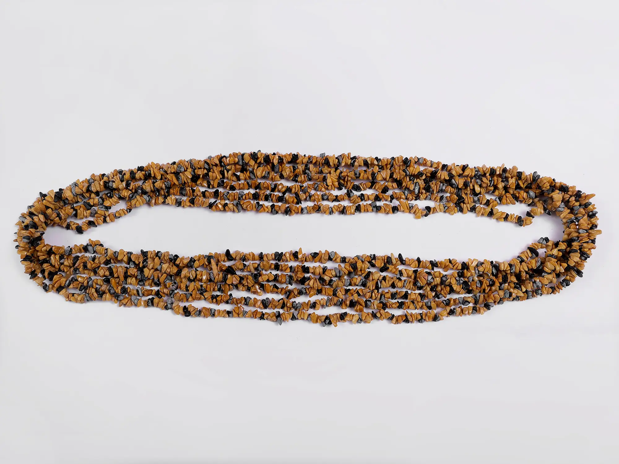 This gemstone is composed of Tiger Eye with Gray Moonstone Chips. Tiger's Eye is a chatoyant gemstone known for its golden to reddish-brown color and silky luster. It is believed to be a powerful stone that promotes clarity, courage, and protection. It is associated with balance, grounding, and the ability to see things as they truly are.
