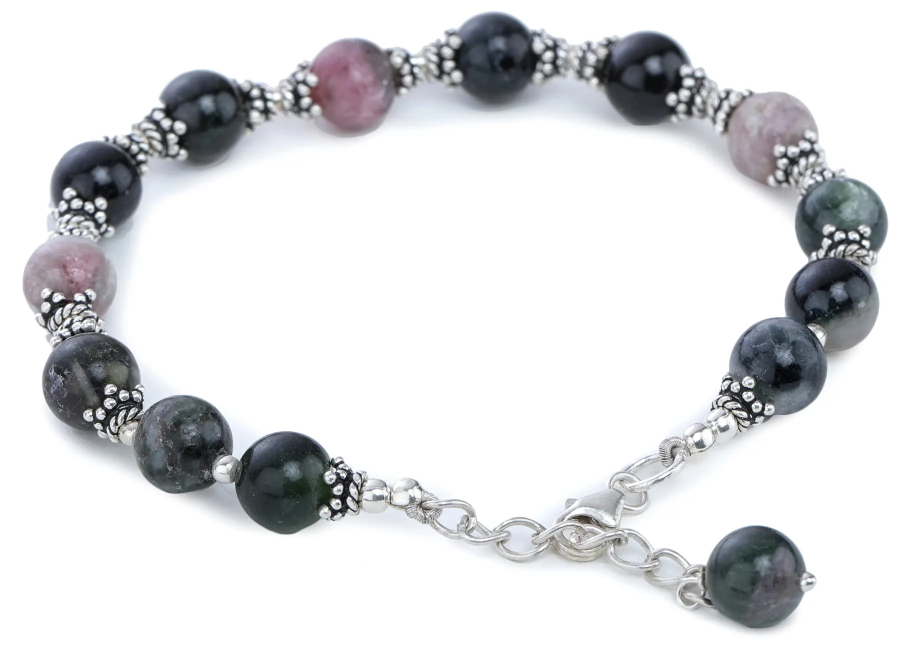 Set against the backdrop of gleaming sterling silver, the tourmaline beads truly come alive. The intricate bead caps that encircle each gemstone not only add a touch of visual texture but also provide a secure and elegant setting. The sterling silver chain is durable and comfortable, ensuring that the bracelet will remain a cherished piece in your jewelry collection for years to come. A delicate charm dangles gracefully from the clasp, offering a subtle touch of whimsy and playful charm.