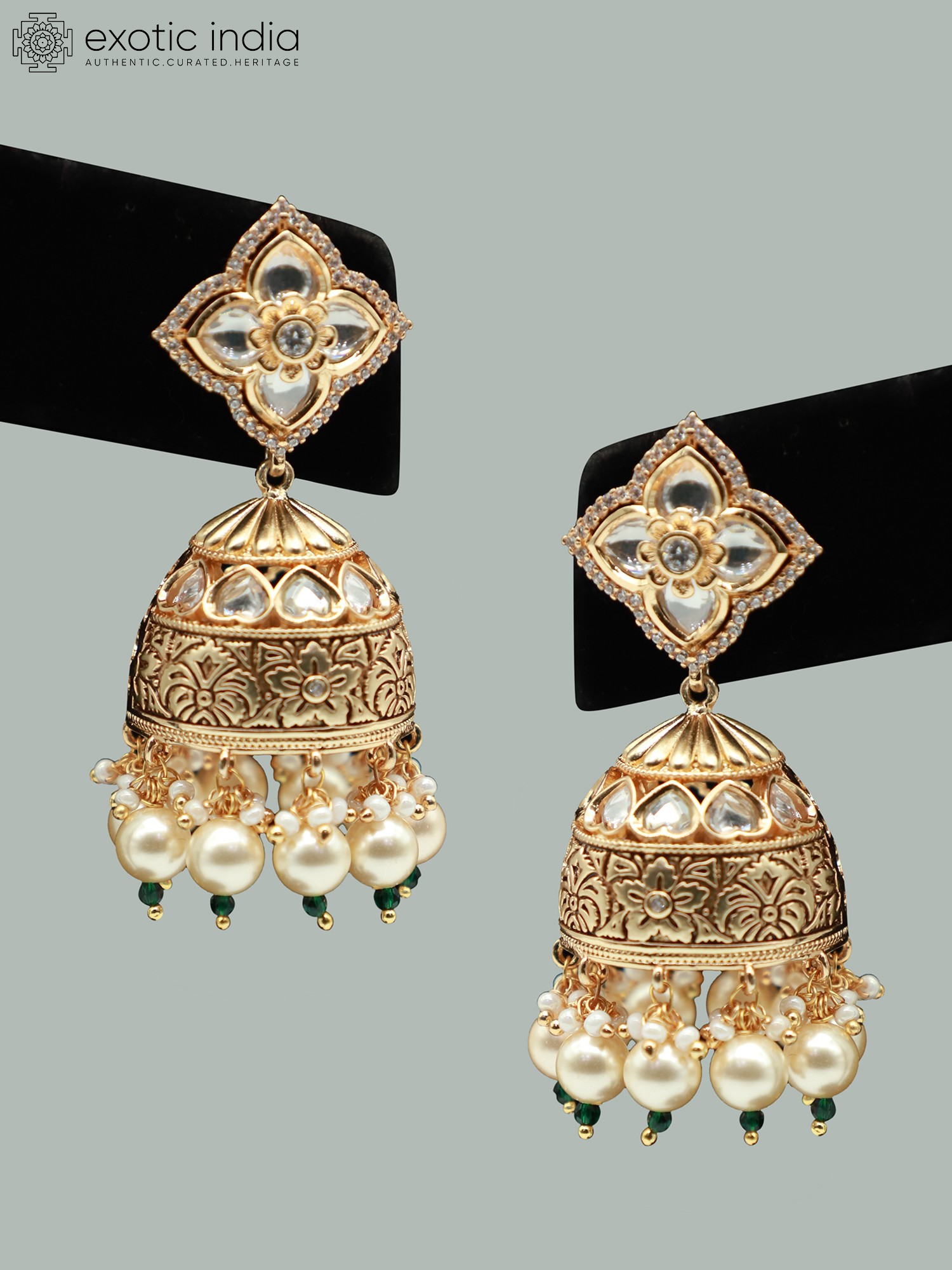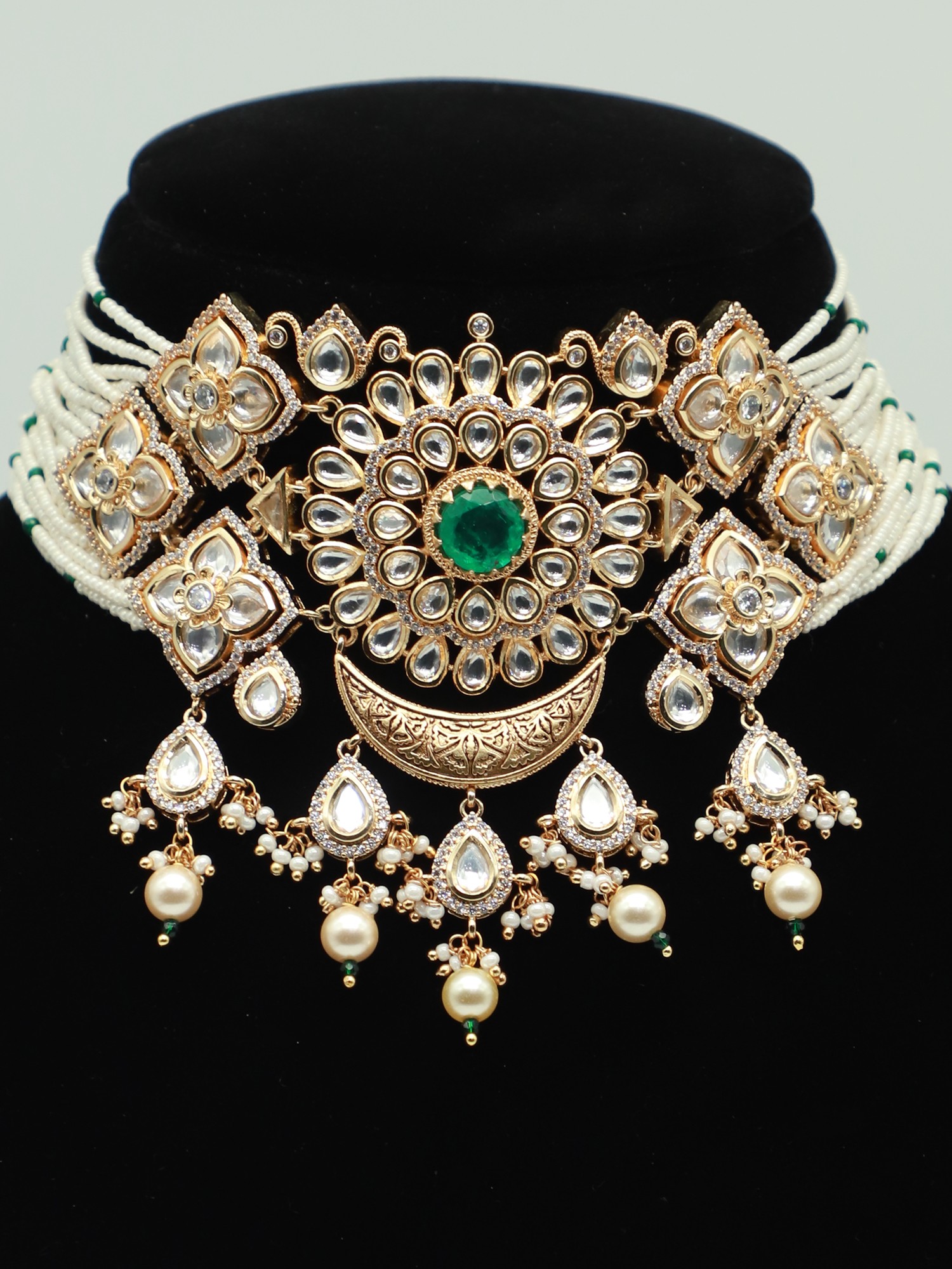 The focal point of the choker is a central floral design with a deep green centerpiece, surrounded by meticulously arranged stones. Below this, a crescent shape adds a touch of whimsical charm. Delicate pearl drops cascade from the choker, creating a gentle swaying motion that catches the light beautifully. The choker is strung along strands of white pearls with interspersed green beads, offering a classic contrast. The earrings mirror the design elements of the choker, featuring a complementary floral stud connected to a traditional jhumka bell shape adorned with hanging pearls. The gold finish adds a touch of warmth and radiance, making this set a truly captivating statement piece.