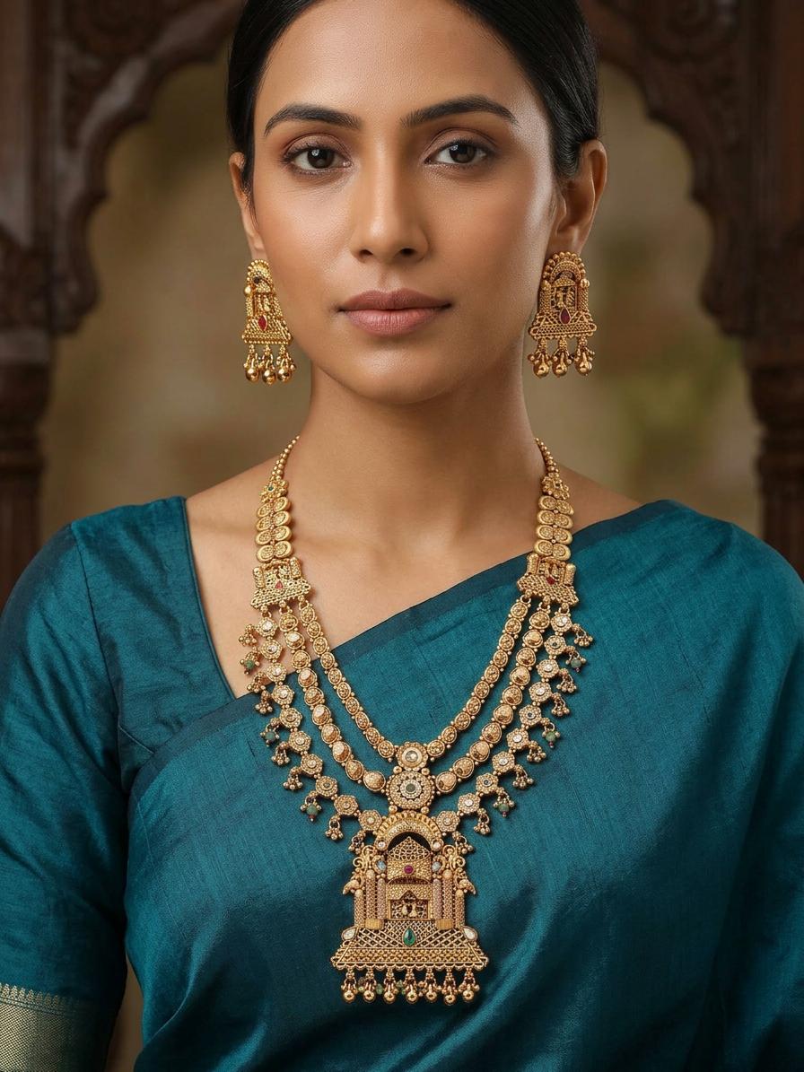 Antique Finish Temple Necklace Set with Statement Earrings