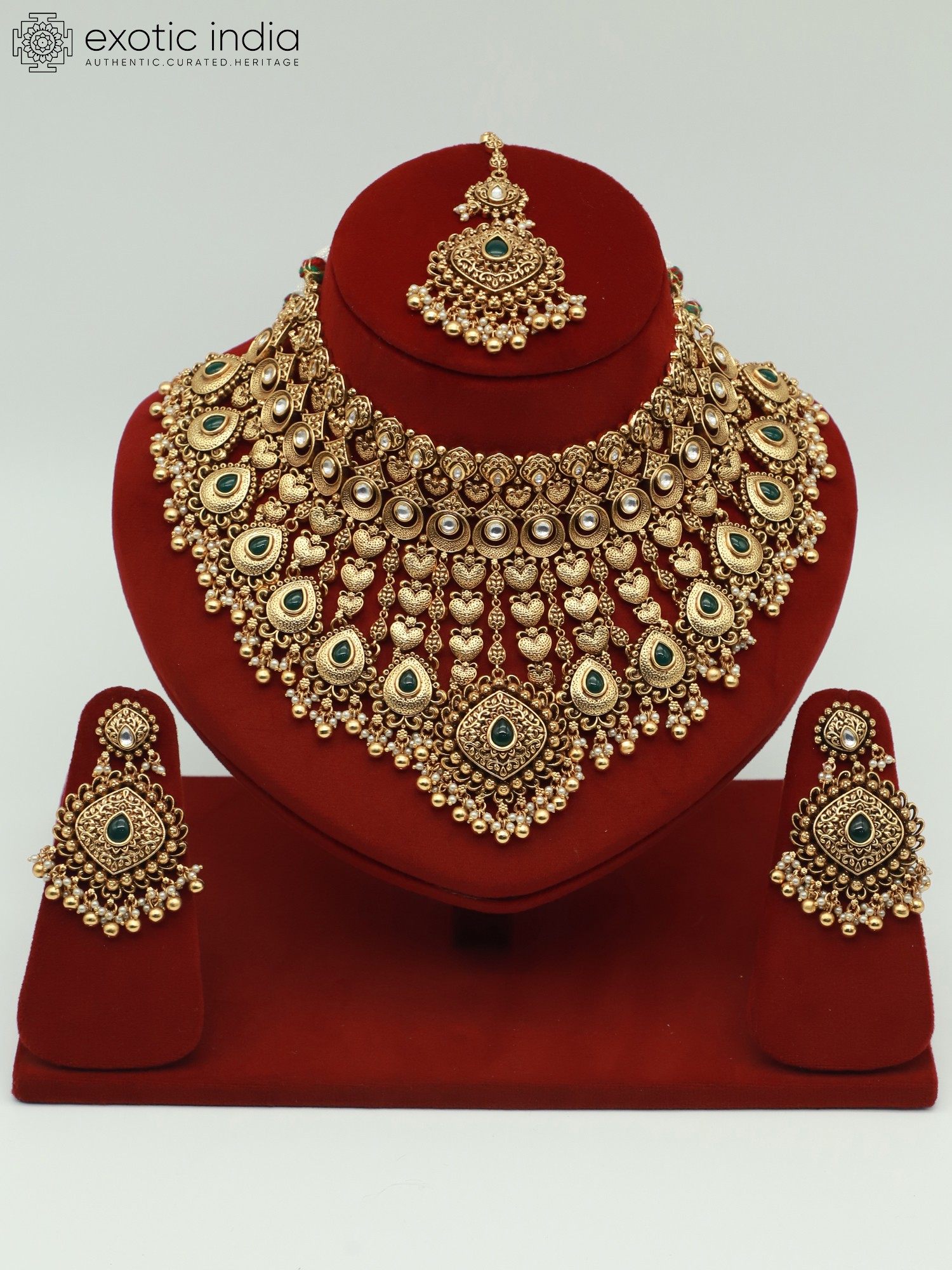 Immerse yourself in the allure of heritage with this exquisite jewelry set, a perfect embodiment of traditional artistry. Meticulously crafted from brass, this set features a stunning necklace, captivating earrings, and a graceful mangtika, all harmoniously designed to create a cohesive and breathtaking ensemble. Each piece reflects the dedication and skill of artisans, promising to be a treasured addition to your jewelry collection. This set is more than an accessory; it is an emblem of cultural richness and timeless elegance.