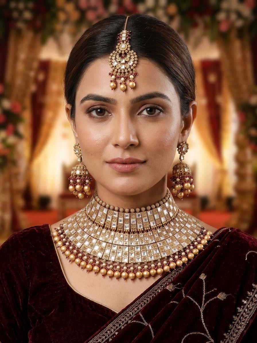 Pearl Drop Kundan Bridal Choker Necklace Set with Earrings and Maang Tikka