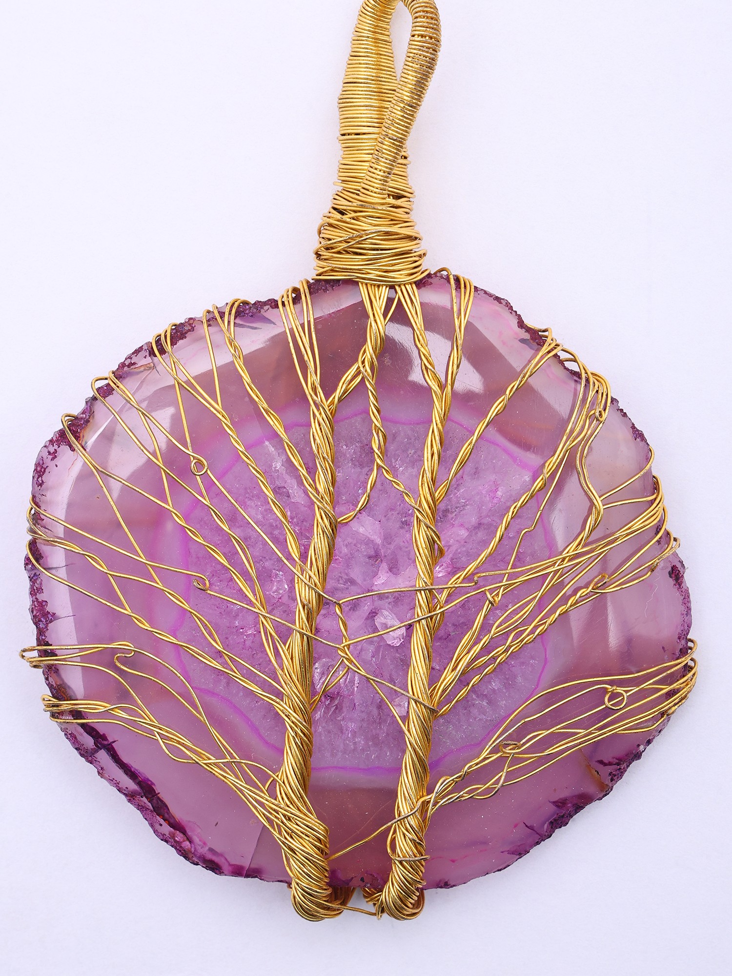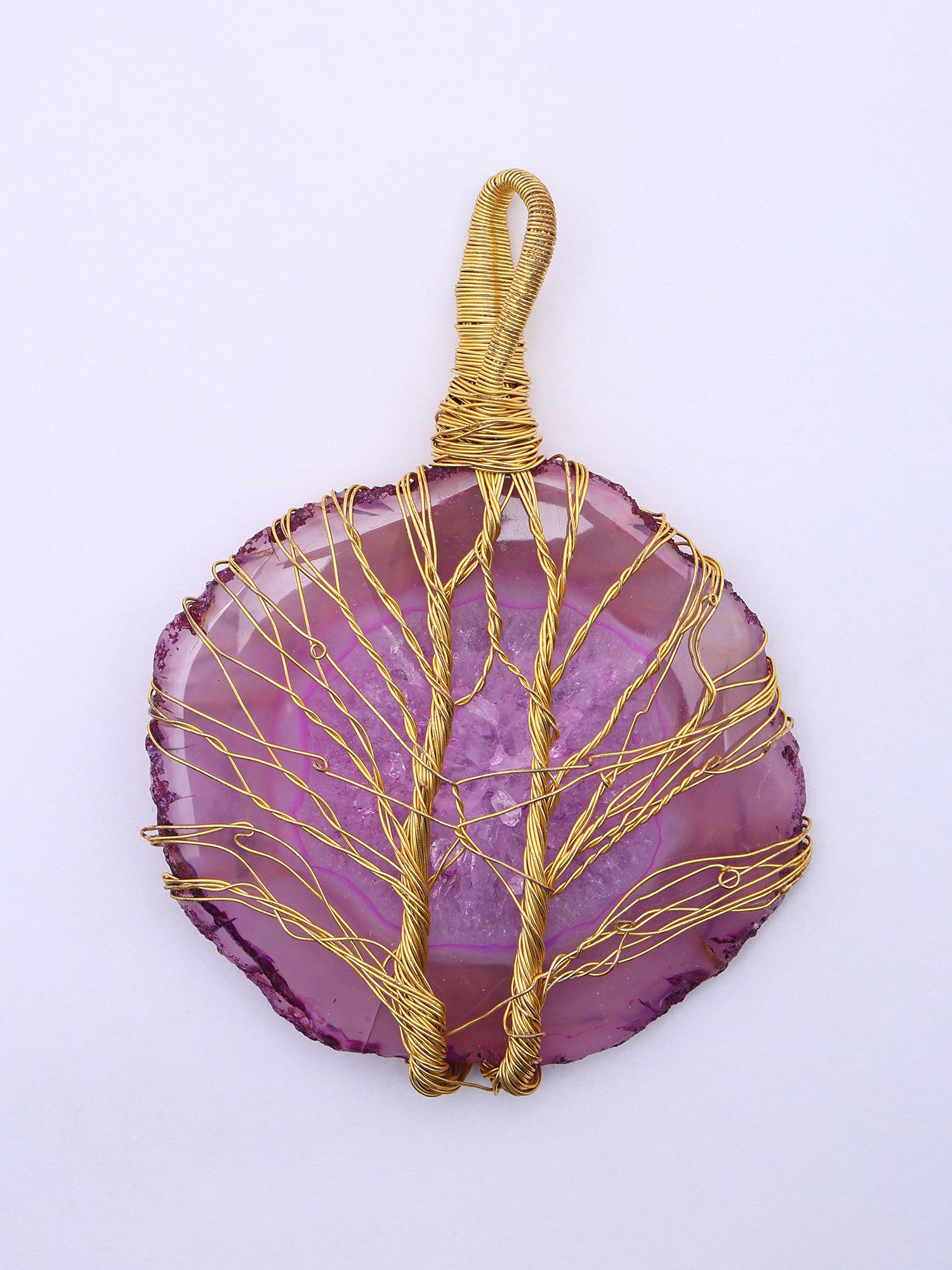 Each pendant is meticulously handcrafted, a testament to the skill of dedicated artisans. The rich, warm tones of the brass wire are expertly shaped to mimic the intricate beauty of a flourishing tree. This delicate framework cradles a captivating purple stone, showcasing its natural formations and unique character.