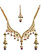 The necklace, with its adjustable cord extending up to seven inches, drapes gracefully to perfectly accentuate your décolletage. Dangling earrings, each measuring a striking two and a half inches in height, sway with captivating movement, mirroring the necklace’s design. The accompanying maang tikka, four and a half inches long, adds a touch of regal sophistication, designed to grace your forehead with delicate artistry. The tri-color palette, a harmonious blend of ruby reds, emerald greens, and lustrous pearls, creates a visually stunning effect.