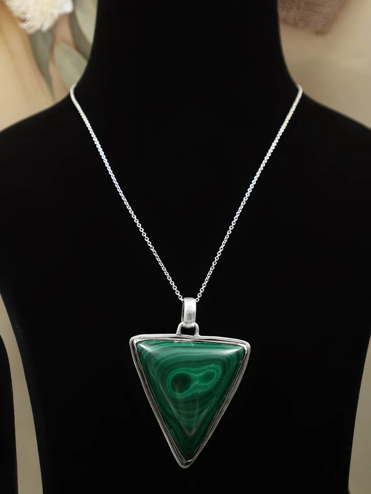 The inverted triangle in Hinduism and Tantra cult represents the unimaginable powers of the Divine Mother-goddess. She protects and revitalizes all life forms. This triangular green Malachite pendant contains the dual healing powers of the stone and the mother-goddess in the form of an inverted triangle. Stylish and eloquent, this sterling silver pendant is undoubtedly a great fashion choice.