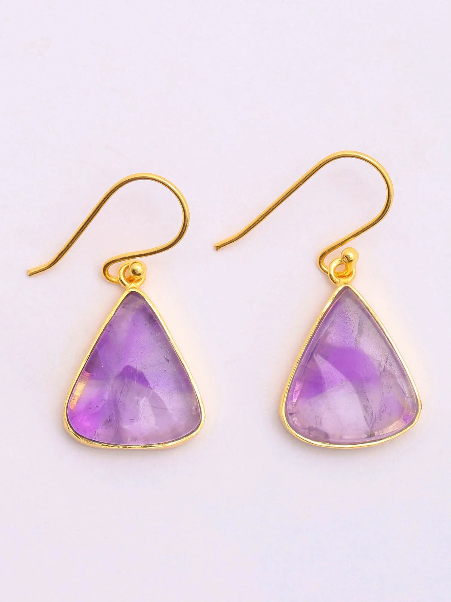 These stunning triangle-shaped amethyst earrings are the perfect addition to any jewelry collection. Crafted with meticulous attention to detail, each earring features a vibrant, naturally-faceted amethyst stone, encased in a beautiful gold-plated sterling silver setting. The rich purple hue of the amethyst contrasts beautifully with the warm gold, creating a truly captivating piece. The simple yet sophisticated design makes these earrings versatile enough for everyday wear or special occasions. Whether you're dressing up for a night out or adding a touch of elegance to your casual look, these earrings will elevate your style.