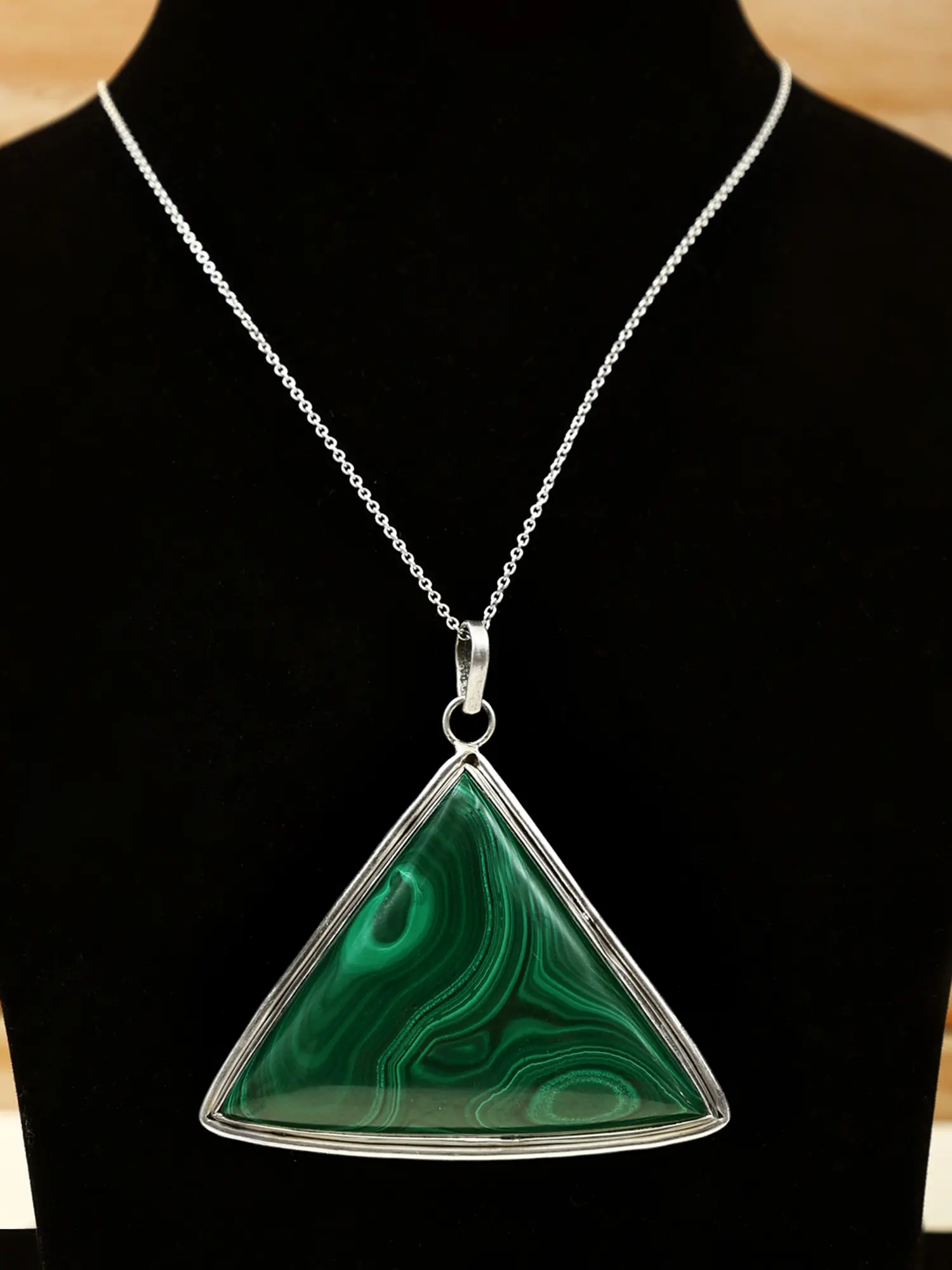 Adorn yourself with geometric elegance by wearing our Triangular Green Malachite Sterling Silver Pendant. The sterling silver setting artfully frames the exquisite green malachite, showcasing its unique triangular shape. This pendant effortlessly combines modern aesthetics with the natural beauty of malachite, creating a bold and stylish accessory.